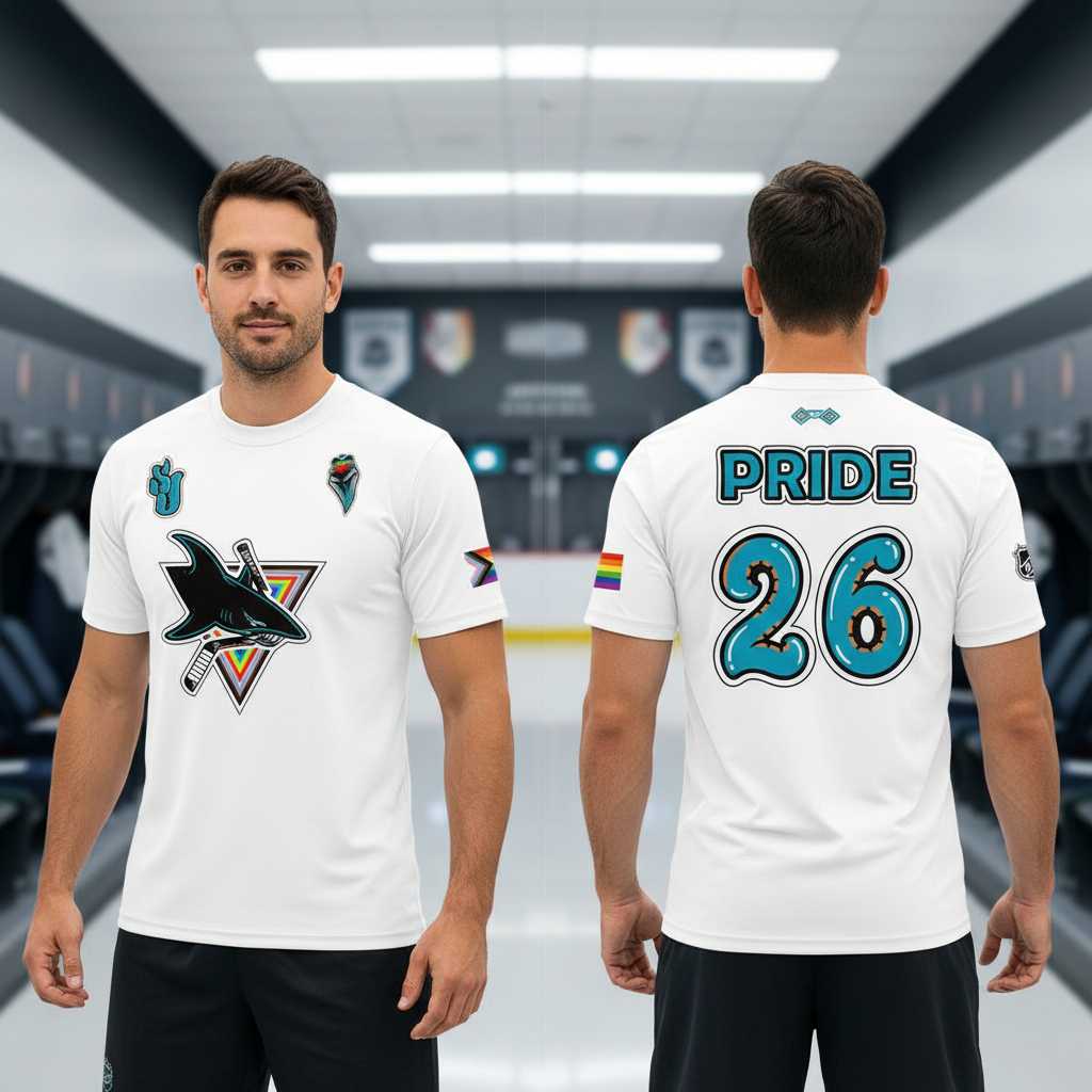 Unleash your team spirit and pride with the San Jose Sharks Pride Group Night 2026 Shirt Hoodie, a truly captivating and meaningful design! This vibrant teal garment makes a powerful statement, featuring the iconic black San Jose Sharks logo breaking through a rainbow-gradient triangle on the front, beautifully symbolizing both hockey passion and LGBTQ+ inclusivity. A hockey stick and puck are integrated into the lower design, while smaller details include an “SJ” shark fin logo on the left chest, a rainbow heart shark fin on the right, and a prominent Pride flag patch on the right sleeve. The back boldly showcases “PRIDE” above large, textured teal and white “26” numbers, creating an unforgettable tribute to unity and support.