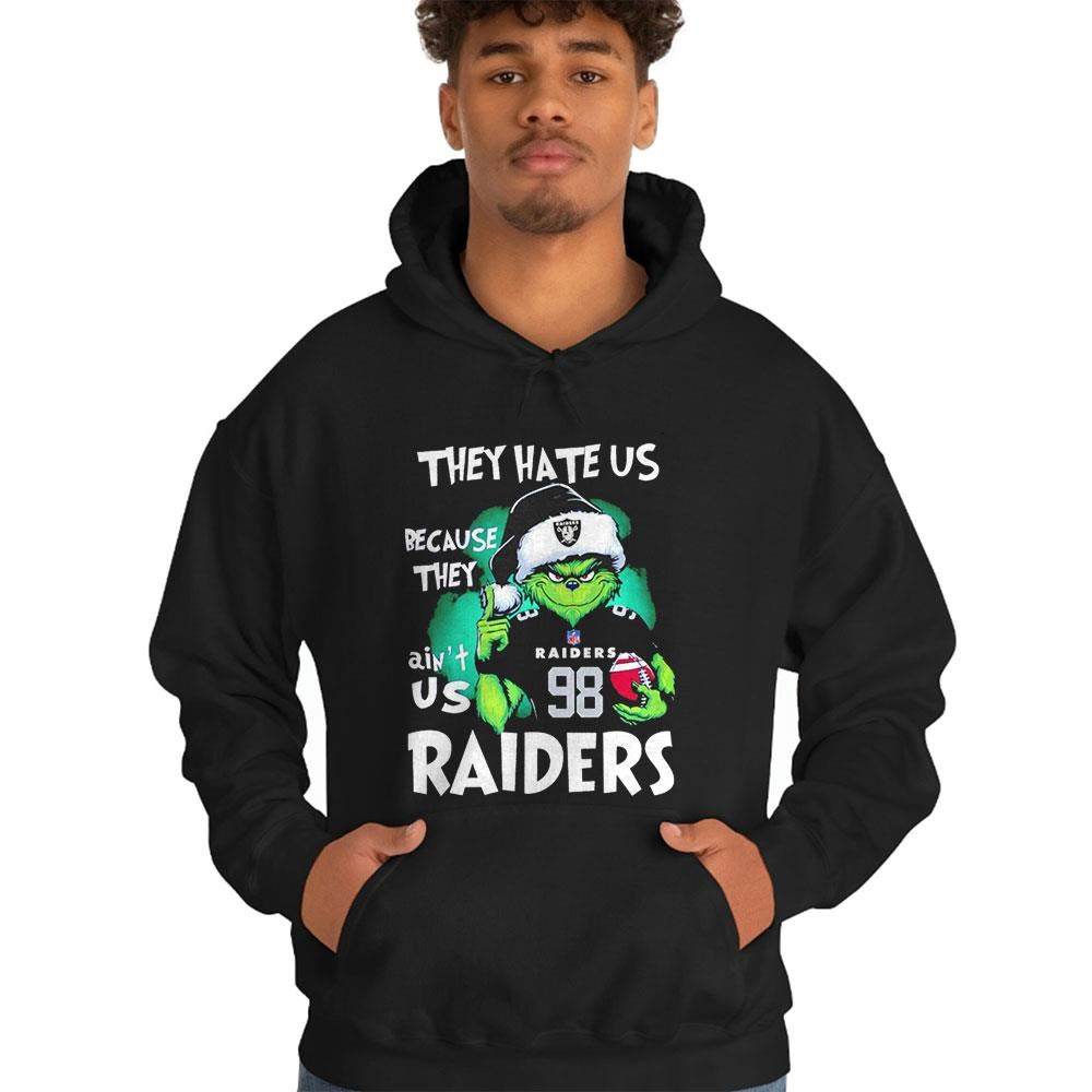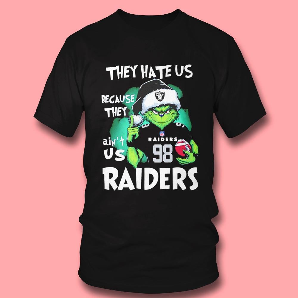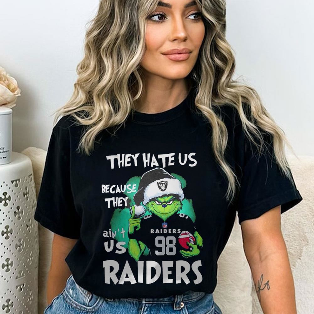 .Introducing the Santa Grinch They Hate Us Because They Ain’t Us Las Vegas Raiders Shirt – a must-have for all die-hard Raiders fans! Show your unwavering support for your favorite team with this unique and eye-catching shirt.