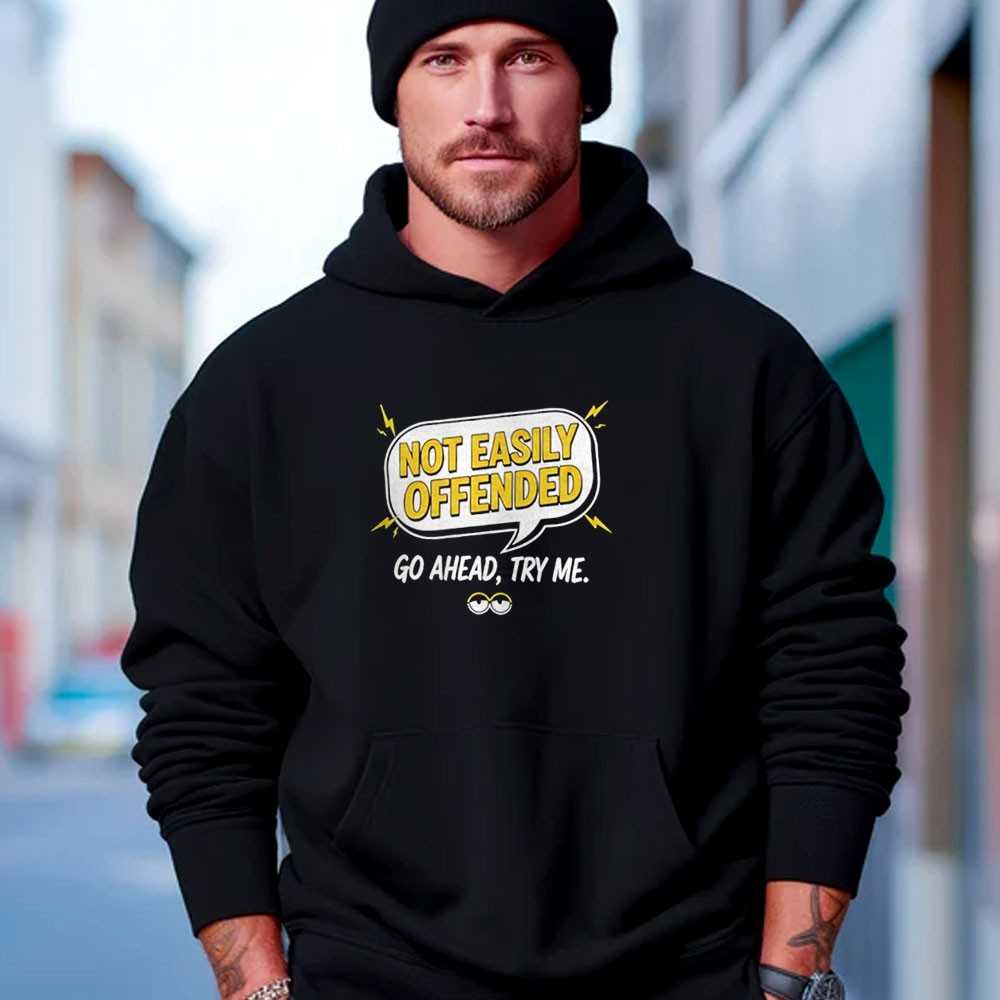 For those with a sharp wit and a thick skin, this tee is the ultimate self-expression piece. The design is intentionally minimalist to let the message speak for itself: “NOT EASILY OFFENDED. GO AHEAD, TRY ME.” The text is rendered in a bold, blocky typography with a slight distressed texture, giving it a rugged and uncompromising appearance. The stark white lettering against the deep black fabric creates a high-impact visual that is impossible to ignore. This isn’t just a shirt; it’s a personality statement that warns others you’ve got a sense of humor and a lot of confidence. The cut is a classic unisex style, designed to be worn loosely for a relaxed, casual vibe. Whether you’re hanging out with friends or navigating the daily grind, this shirt adds a layer of edgy attitude to your look. If you value honesty and a good laugh, this is the shirt for you. Step up your wardrobe game—get the Sarcastic Quote Not Easily Offended Casual Tee today and let your shirt do the talking!.
