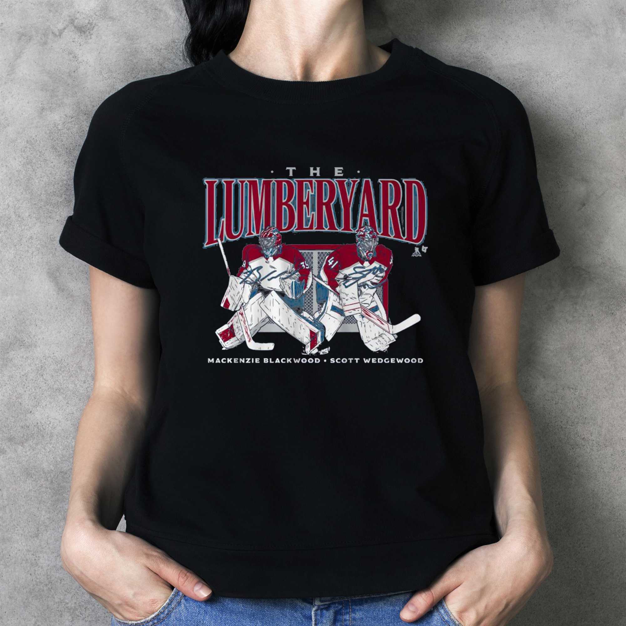 Ready to defend the net in style? The “Scott Wedgewood – Mackenzie Blackwood The Lumberyard Shirt” boldly celebrates two of hockey’s finest shot-stoppers. This striking design features “THE LUMBERYARD” in a distressed red and blue font arched above two detailed illustrations of goalies in red, white, and blue gear, poised before a textured net. Below them, “MACKENZIE BLACKWOOD • SCOTT WEDGEWOOD” is displayed. This vintage, gritty art style perfectly encapsulates the hard-nosed, physical battle fought in the crease, affectionately known as “The Lumberyard,” where pucks are chopped and shots are denied with relentless determination. It’s a humorous and powerful nod to these unsung heroes.