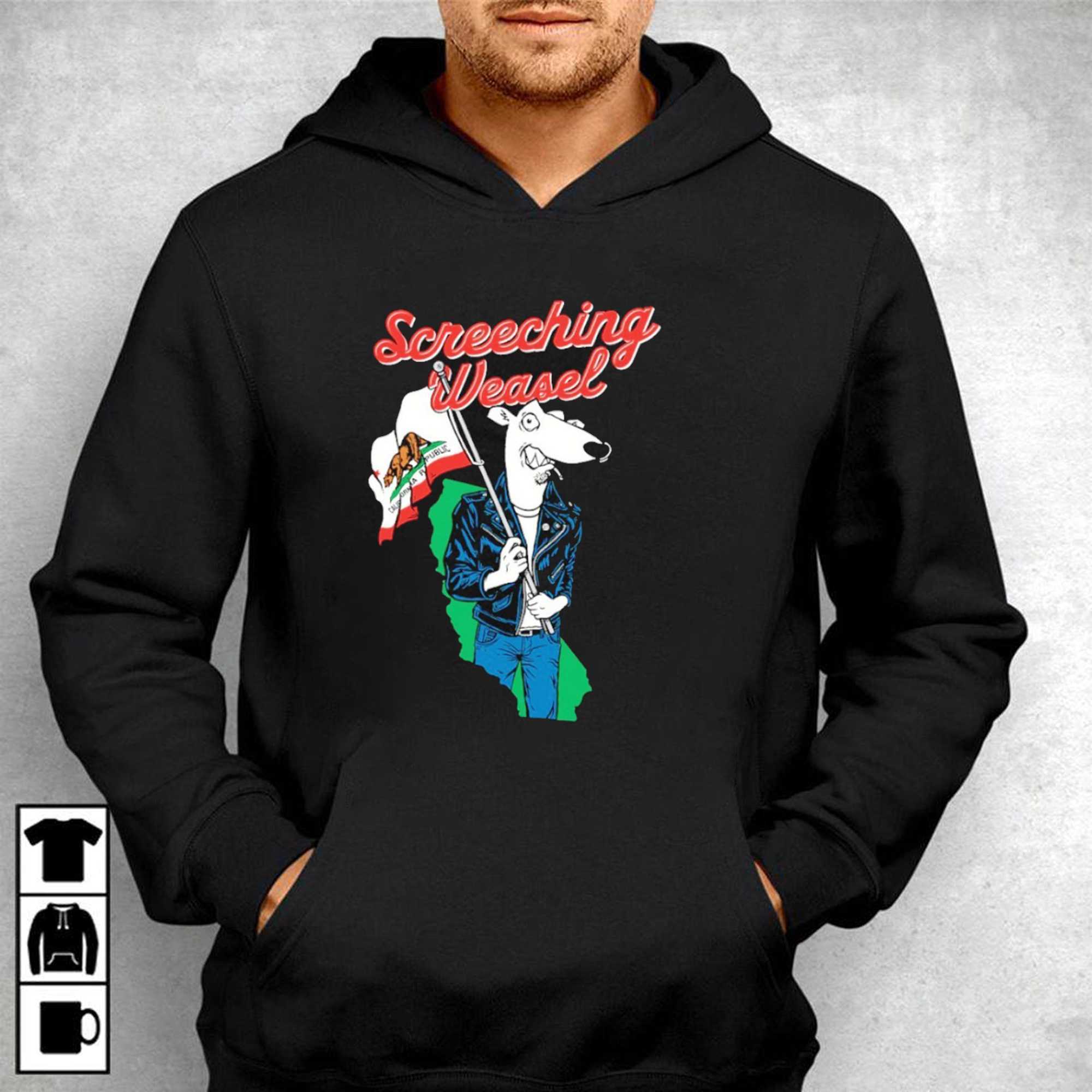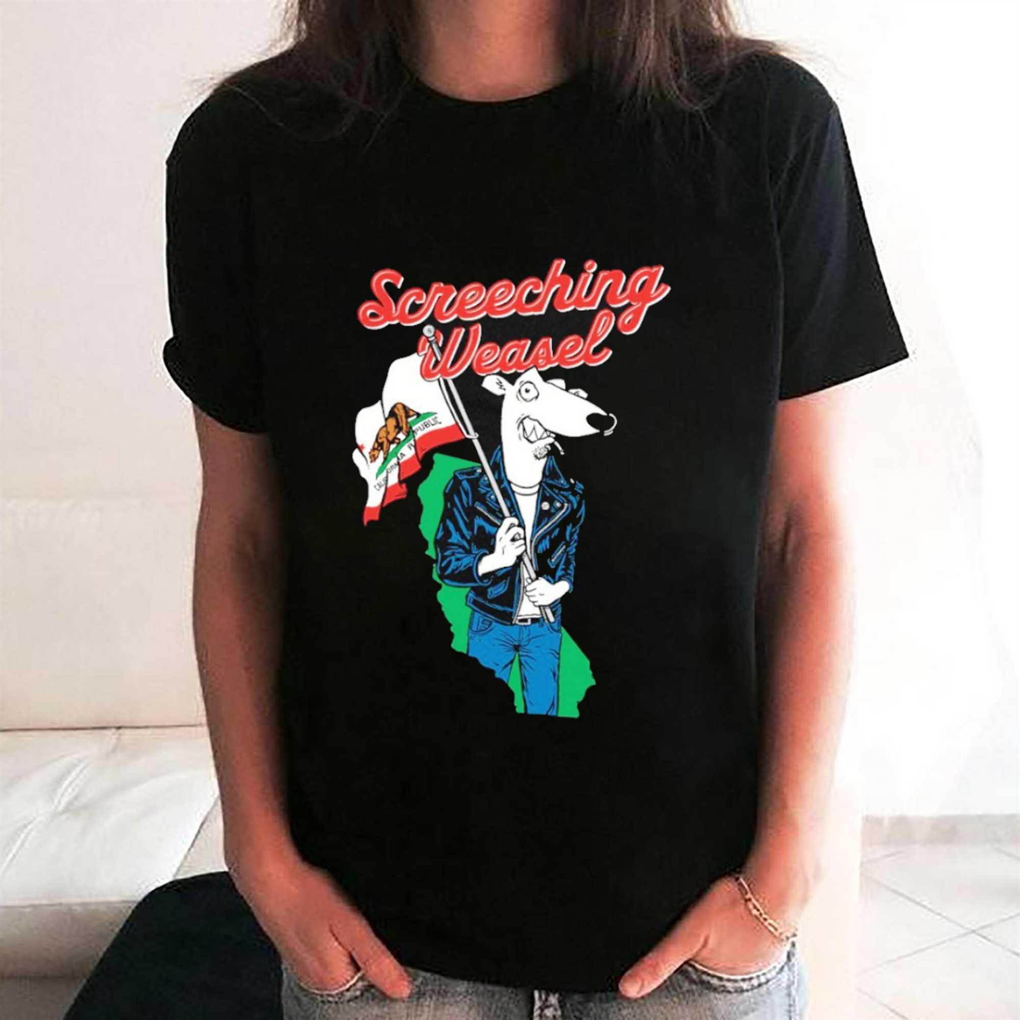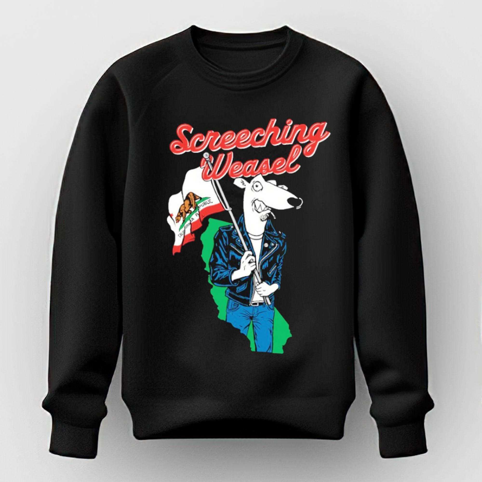 Celebrate the high-energy spirit of the West Coast punk scene with the Screeching Weasel California Weasel Tee. This design is a vibrant tribute to the legendary pop-punk pioneers, featuring the iconic weasel mascot decked out in classic California-cool gear. The artwork captures the rebellious and playful energy of the band, with bold “California” typography and a palm-tree aesthetic that screams summer rebellion. This is an absolute must-have for the “Ben Weasel” faithful and anyone who grew up with the sounds of Lookout! Records. The high-contrast green, white, and black colors pop with professional intensity on the deep black tee. This shirt is crafted from premium, heavy-weight cotton, offering a structured fit and long-lasting durability that can handle any mosh pit or house party. The fabric is soft-washed for a comfortable, “broken-in” feel from the very first day. It celebrates a band that helped define a generation of independent music. Whether you’re heading to a local show or just showing off your punk-rock credentials, this shirt ensures you look the part. Support the legacy of three chords and a middle finger. Don’t settle for boring, standard graphics—go for the weasel. Secure your piece of punk history and buy the Screeching Weasel California Weasel Tee today!. T-shirt !
