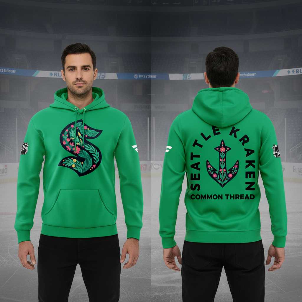 More than just fan apparel, this is a bold statement piece designed to express your distinct personality and unwavering allegiance, whether you’re at the rink, out with friends, or simply relaxing. Elevate your wardrobe with the unparalleled style and comfort of the Seattle Kraken Green Night Kraken Common Thread 2026 Hoodie T Shirt, a true conversation starter that connects you to both nature and your favorite team. Make a splash with this exquisite blend of sport and art. Add to Cart and wear your Kraken pride with floral flair!