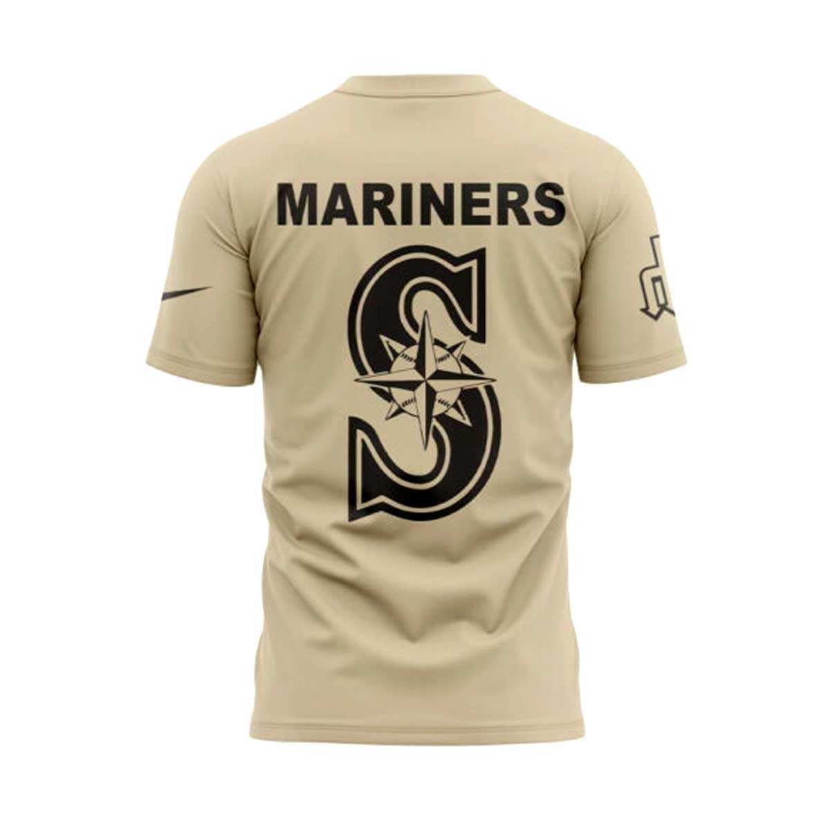 “, “alt_text”: “Seattle Mariners Pho Kit Shirt: Tan tee with front pho bowl graphic, back “MARINERS” text and compass logo.”}