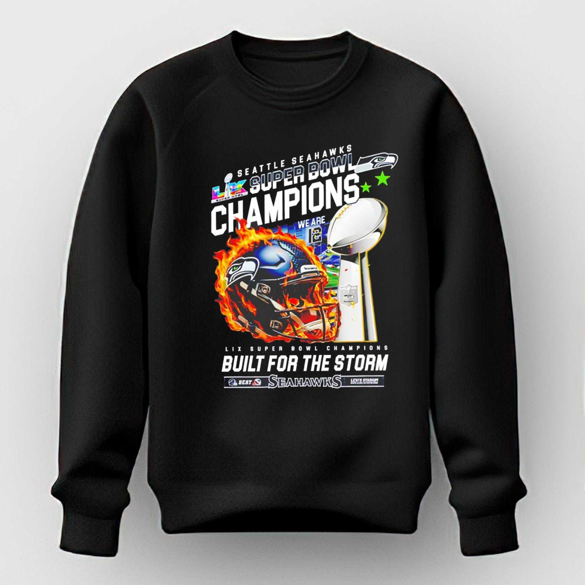Celebrate the ultimate triumph of the Pacific Northwest with the Seattle Seahawks Lix Super Bowl Champions Built For The Storm We Are 12 Tee. This commemorative design is a high-octane tribute to the 12th Man and the team’s historic victory on the world’s biggest stage. The graphic features a massive “CHAMPIONS” branding integrated with the official Super Bowl LIX logo and the bold “BUILT FOR THE STORM” mantra. It captures the resilience, the noise, and the collective spirit that defines Seattle football culture.