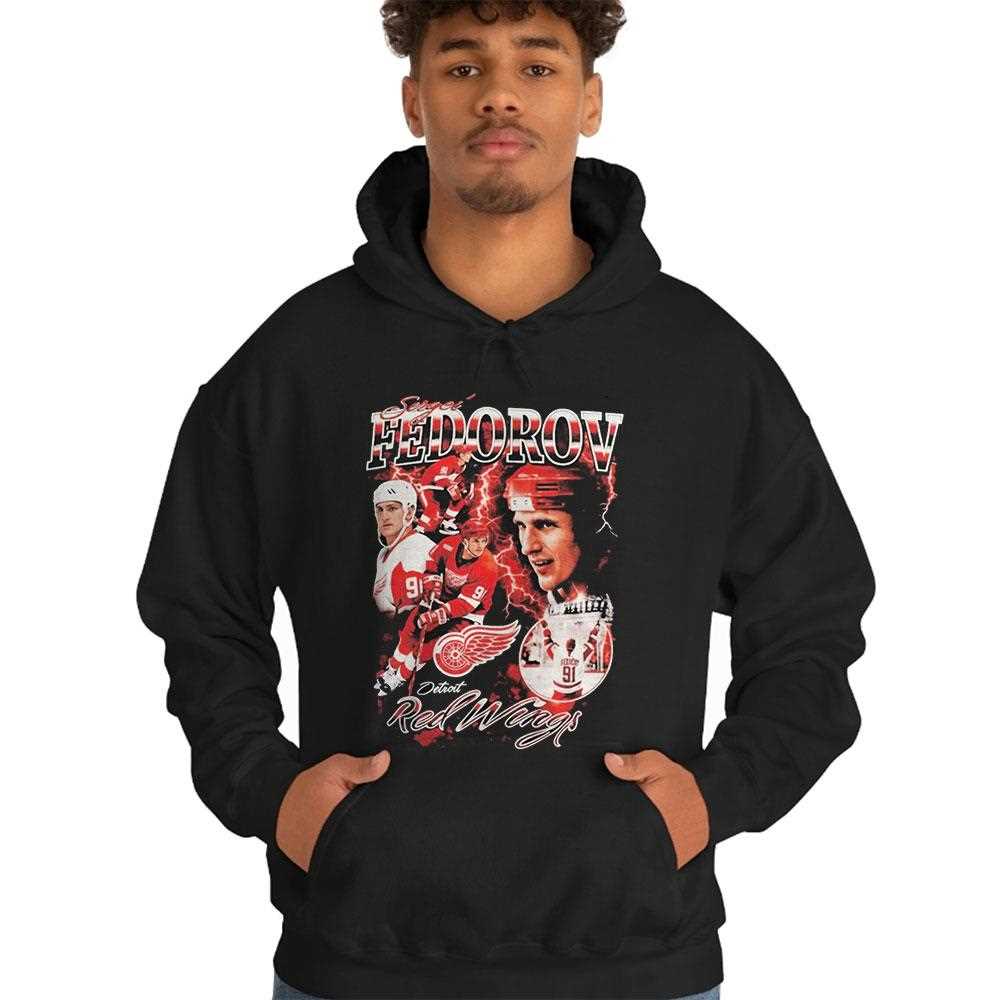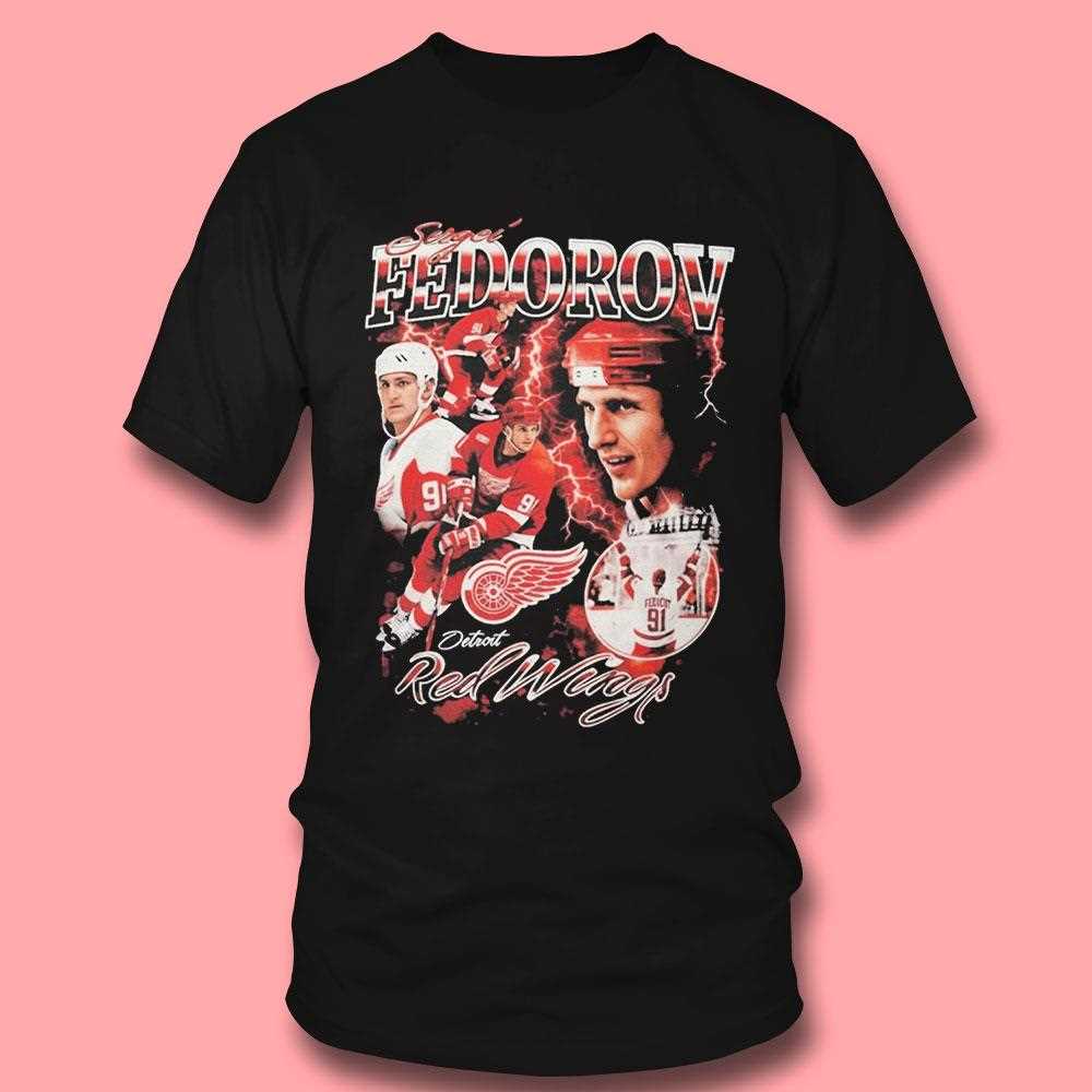 Pay homage to one of the most versatile and talented players to ever lace up skates in Hockeytown with the “Sergei Fedorov Detroit Red Wings 2026” tribute tee. This design is a nostalgic masterpiece for fans of the “Russian Five” era, featuring a high-resolution artistic collage of Sergei Fedorov in his prime. The graphics capture his effortless skating stride and his legendary #91 jersey, rendered in a vintage 90s aesthetic that feels both retro and modern. The bold “FEDOROV” typography at the top uses a metallic-textured font that reflects the speed and precision of his game. Set against a professional black background, the classic Red Wings red and white pop with cinematic energy. Crafted from a soft-wash, pre-shrunk cotton blend, this shirt offers a “lived-in” feel and a comfortable, relaxed fit that’s perfect for cheering at Little Caesars Arena or a casual night out. The print quality is top-tier, ensuring the intricate details of the hockey gear and the player likeness remain sharp and vivid for seasons to come. It represents a golden age of Detroit hockey and honors a true Hall of Famer’s legacy. Celebrate the speed and grace of number 91—secure your Sergei Fedorov Detroit Red Wings 2026 Tee today and wear the legend!. T-shirt !