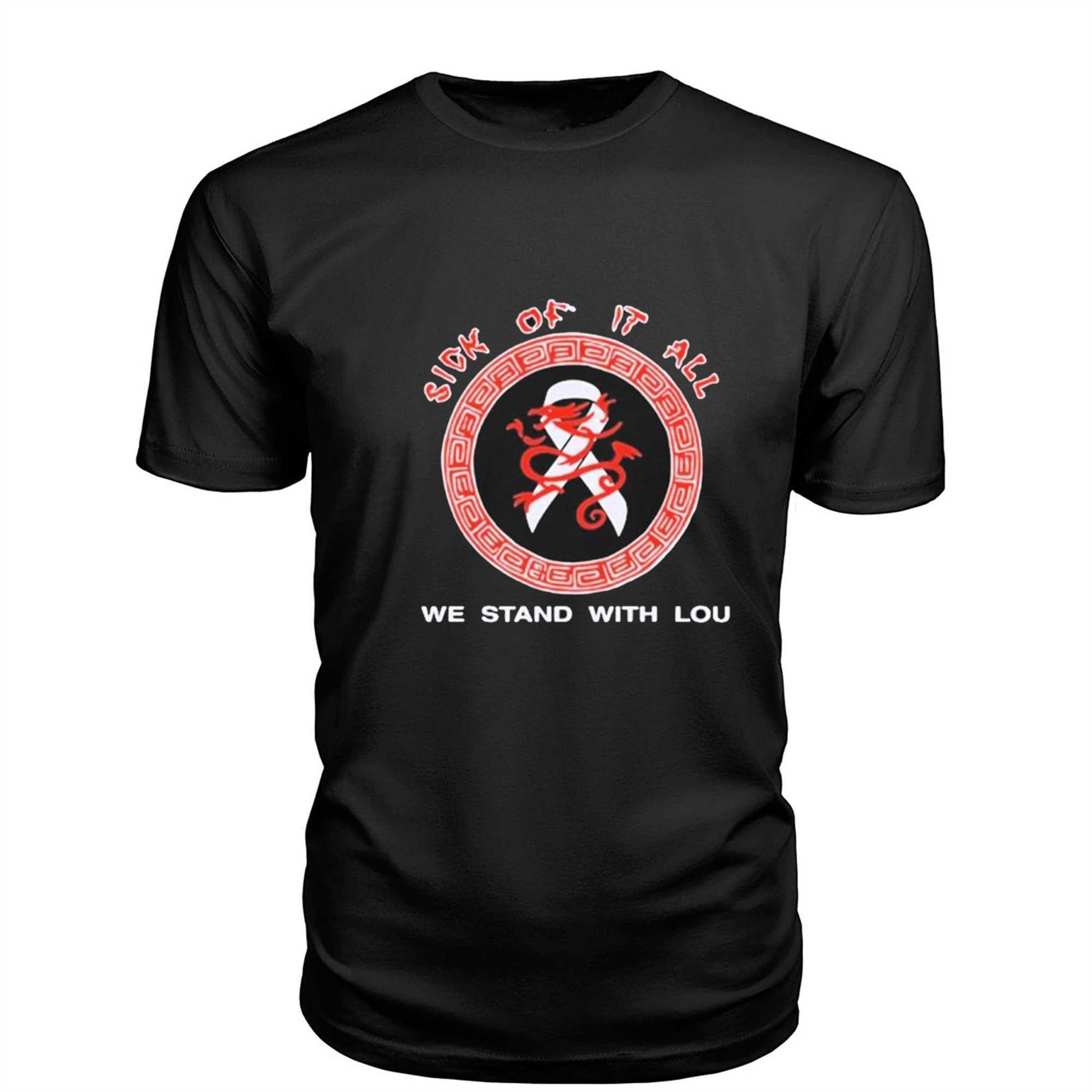 Show your unwavering loyalty to the heart and soul of the New York hardcore scene with the Sick Of It All Stand With Lou Tee. This design is a powerful and atmospheric tribute to the legendary frontman Lou Koller, featuring a high-quality graphic that captures the grit, the energy, and the resilience of NYHC history. The central emblem showcases the iconic Sick Of It All dragon logo intertwined with messages of support and solidarity, rendered in a striking red and white palette on a deep black base. This isn’t just a band shirt; it’s a call to action for the global hardcore family to stand with an icon during a time of need. It represents a commitment to the music, the community, and the bonds that are forged in the mosh pit. Crafted from premium, heavy-duty cotton, this tee offers a structured fit and exceptional durability for long concert nights or daily street wear. The fabric is soft-washed for a comfortable, “broken-in” feel that reflects the authenticity of the genre. Every detail, from the reinforced neckline to the sharp screen print, honors the decades of influence SOIA has had on alternative culture. Whether you’re heading to a local show or just showing off your impeccable taste in musical history, this shirt identifies you as a part of the movement. Stand with the best and represent the legends of Queens. Secure your piece of the sound and purchase the Sick Of It All Stand With Lou Tee today to stay loud!.