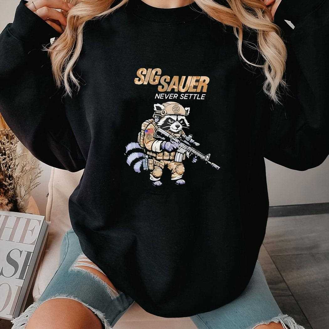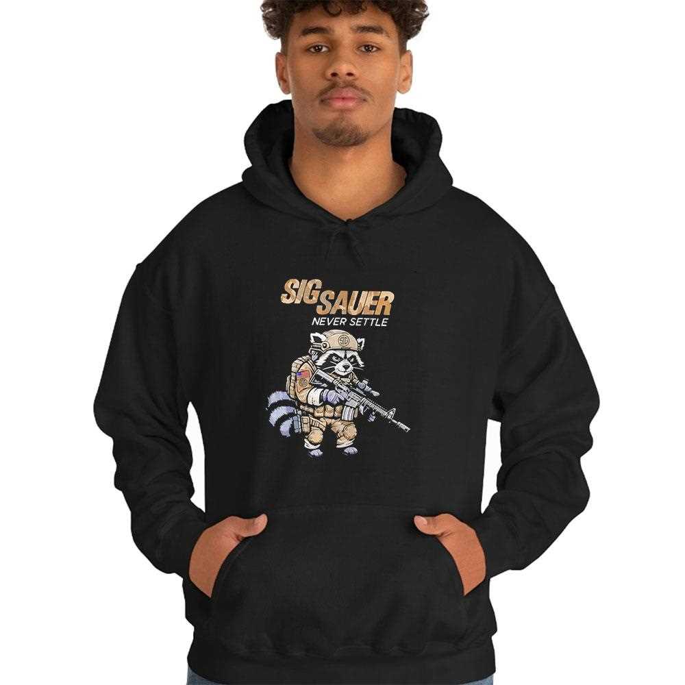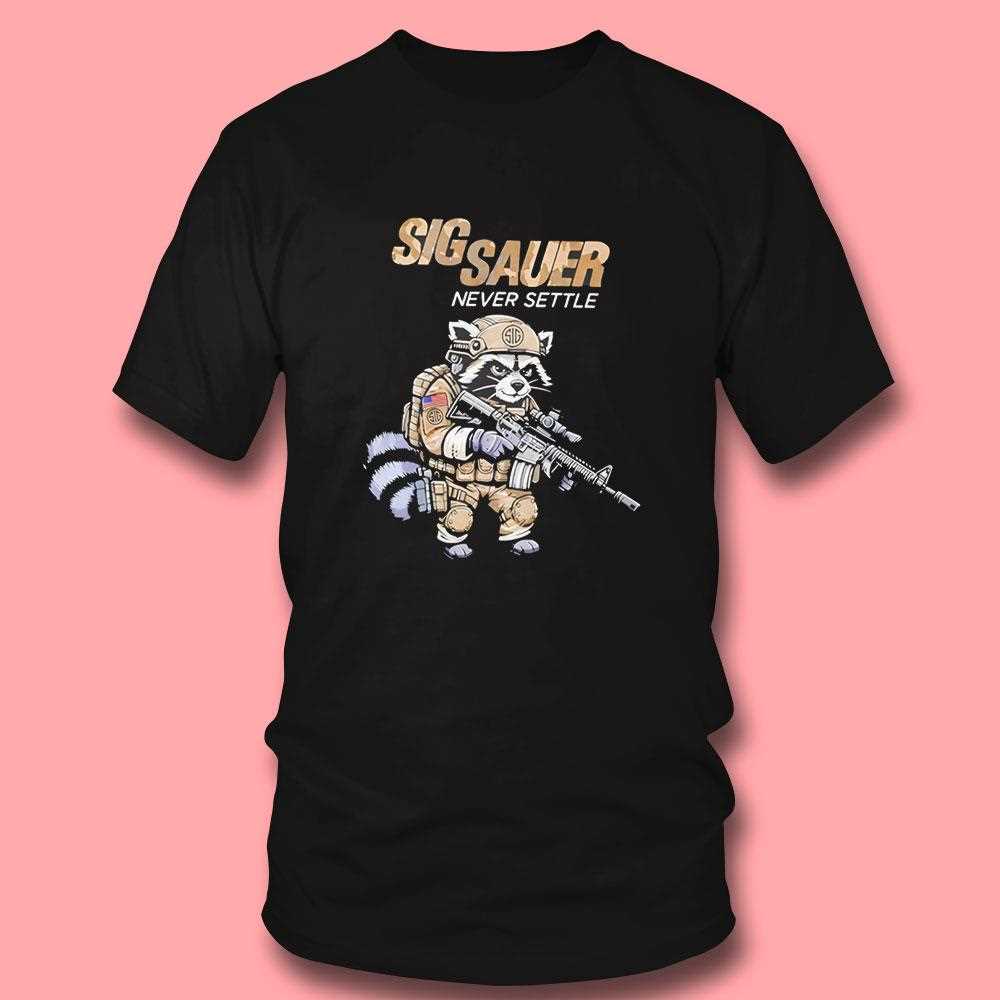 Blend tactical grit with a touch of rugged humor! This unique design features a determined raccoon mascot decked out in tactical gear, clutching a Sig Sauer rifle, embodying the “Never Settle” spirit. Set against a high-contrast black fabric, the graphic utilizes earthy camo tones and sharp details to create a look that is both professional and playful. It’s a bold statement piece for firearm enthusiasts, outdoor adventurers, and those who appreciate unique character design. The shirt itself is made from a durable, heavyweight cotton blend that stands up to the rigors of an active lifestyle while maintaining its shape. The print is engineered with fade-resistant technology, ensuring your raccoon-soldier stays looking sharp. Show the world you have a sense of humor as strong as your principles. Embrace the tactical lifestyle with a unique twist—get your Sig Sauer Never Settle Raccoon Camo Tee right now!. T-shirt !