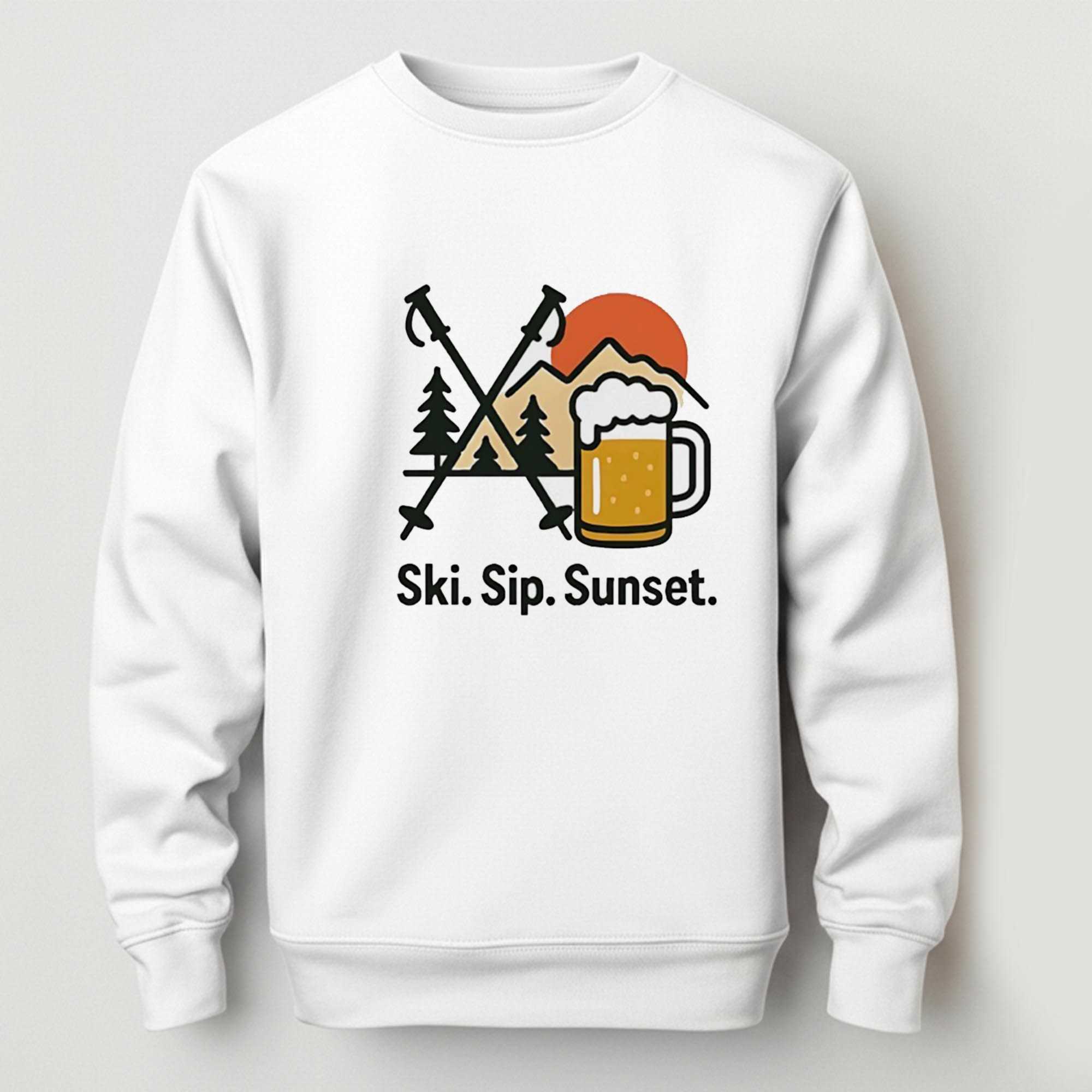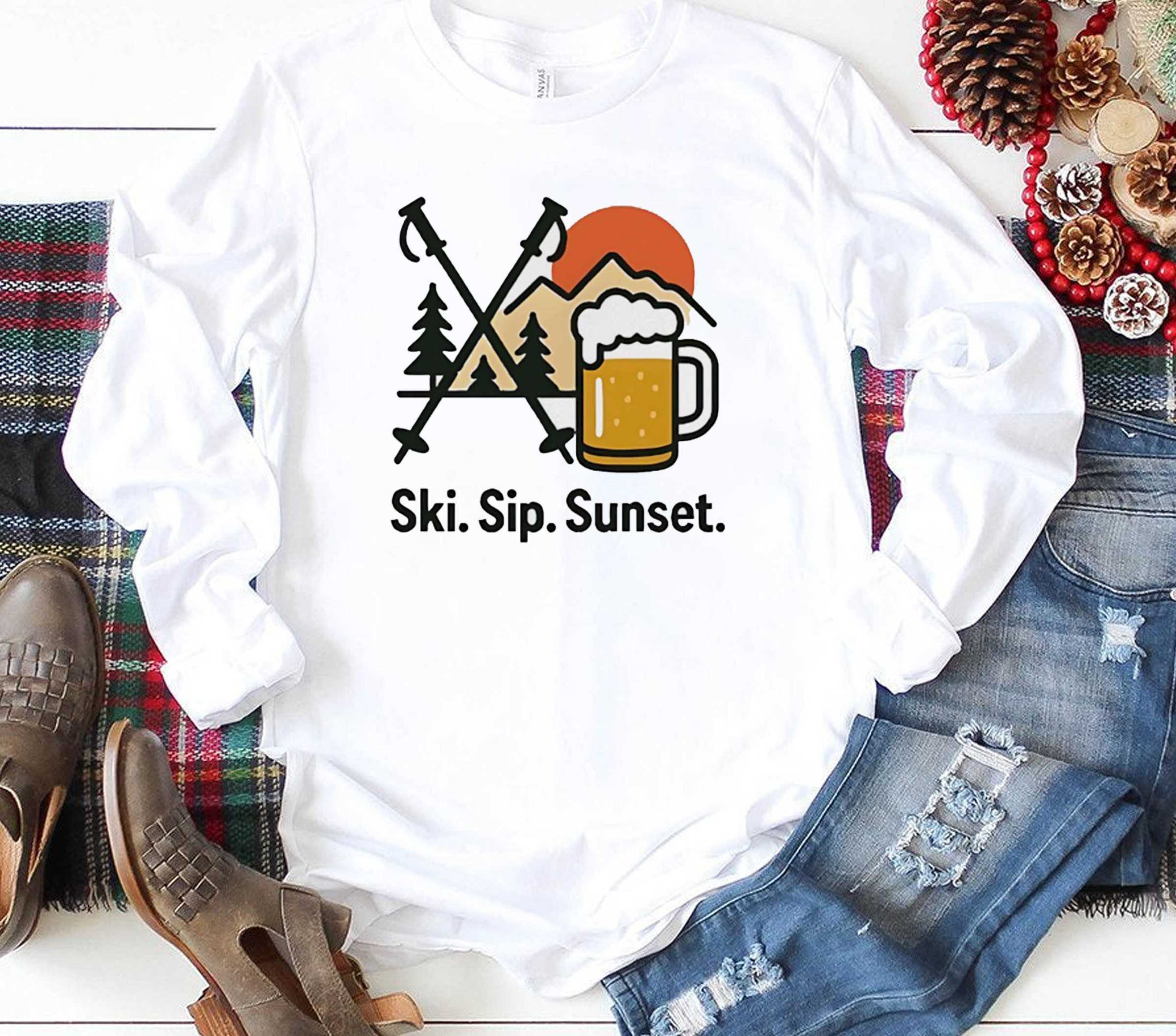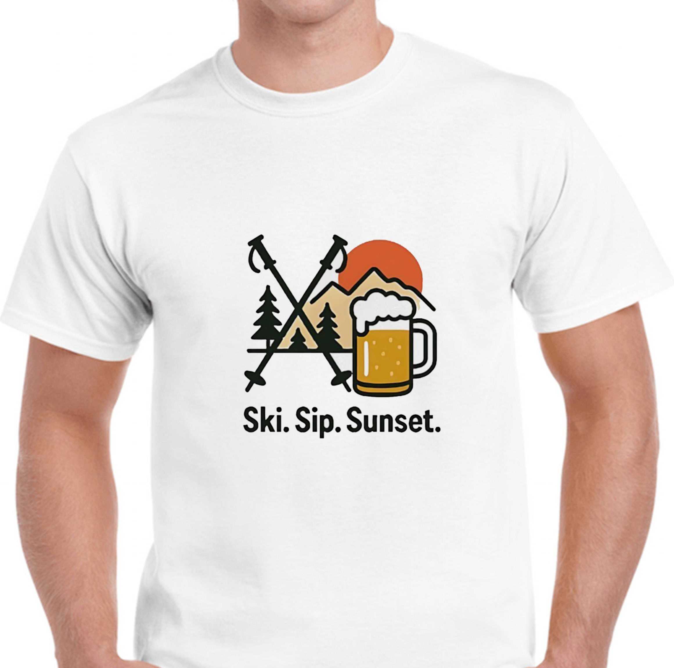 The “Ski Sip Sunset Tee” is your ultimate post-piste wardrobe essential, capturing the quintessential joy of mountain life. This witty design features two crossed black ski poles prominently layered over two dark green pine trees and soft beige mountains, all silhouetted against a warm, burnt orange sunset. But the real star, ready to toast your accomplishments, is the large, frothy mug of golden beer, sitting cheerfully in the foreground. Below this vibrant scene, the bold, black text “Ski. Sip. Sunset.” perfectly encapsulates the simple, blissful cycle of hitting the slopes, enjoying a refreshing brew, and soaking in the evening’s last light. It’s a playful ode to the perfect apres-ski unwind.