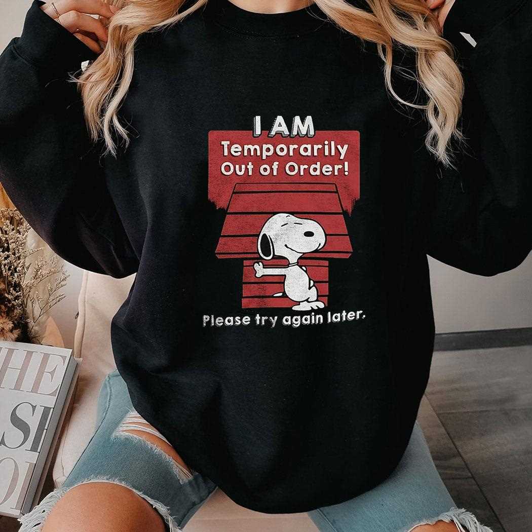 ..Introducing the Snoopy I Am Temporarily Out Of Order Shirt—a playful yet poignant addition to your wardrobe that speaks volumes about embracing life’s little quirks. This shirt is not just a piece of clothing; it’s a statement. With its charming design featuring the beloved Peanuts character, Snoopy, it perfectly captures those moments when we all feel a little overwhelmed and in need of a break.