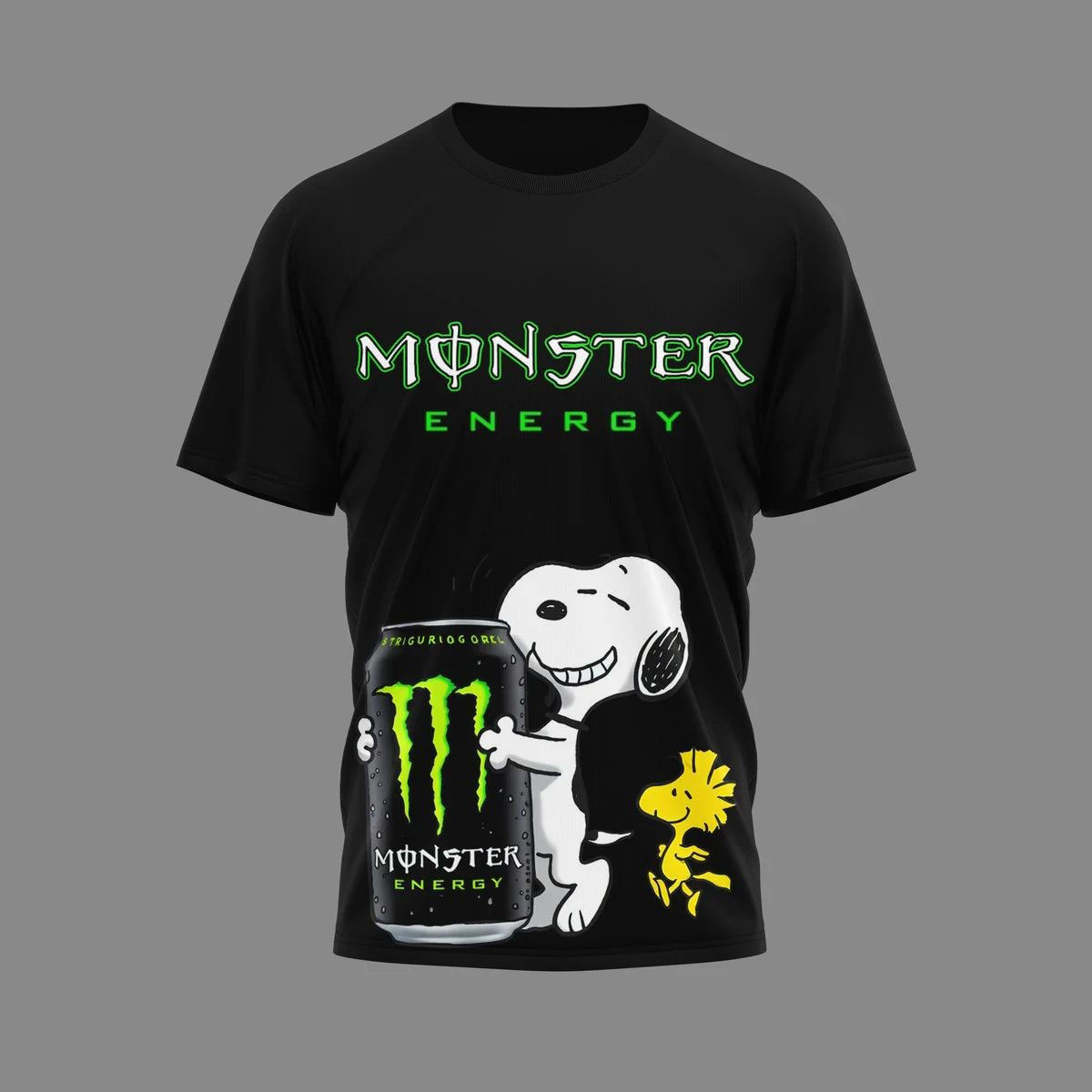 Unleash your inner speed demon with the Snoopy Monster Energy Drink Motocross Tee Hoodie! This design hilariously merges the iconic Peanuts beagle, Snoopy, with the raw power of Monster Energy. On the front, against a sleek black backdrop, a cheerful Snoopy, accompanied by Woodstock, proudly clutches a Monster Energy can beneath the vibrant green Monster Energy logo. The reverse explodes with energy: a frantic Snoopy, eyes wide and mouth agape, vigorously shaking a Monster can, sending a dynamic green liquid splash across the black fabric, all under the bold declaration ‘Powered by Monster.’ It’s a witty visual narrative of pure, unadulterated cartoon chaos fueled by motocross passion, perfectly capturing that adrenaline rush.