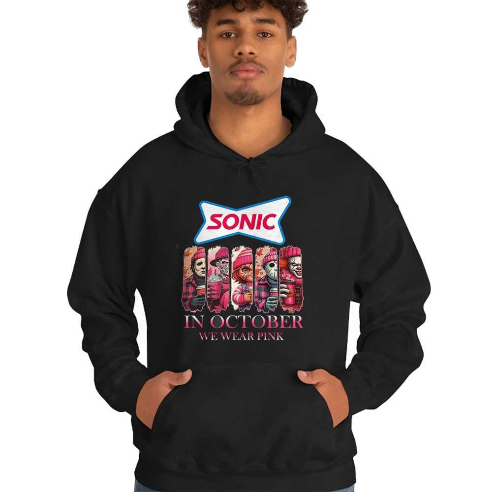 Race into frights with a fast-food twist in our “Sonic Horror Characters In October We Wear Pink Tee.” This delightfully eerie design features a playful twist, showcasing iconic horror characters enjoying a chili dog or lurking within a Sonic Drive-In-inspired setting, all while supporting breast cancer awareness with the “In October We Wear Pink” message. The graphic cleverly blends classic frights with a touch of fast-food fun and a meaningful cause. Printed on a comfortable, high-quality tee, it’s perfect for horror fans with a sense of humor and a big heart. This shirt is a conversation starter, perfect for Halloween parties or charitable events. Drive-in scares! Support a great cause with a ghoulish grin. Grab your Sonic Horror Characters In October We Wear Pink Tee and wear your heart on your sleeve!. T-shirt !