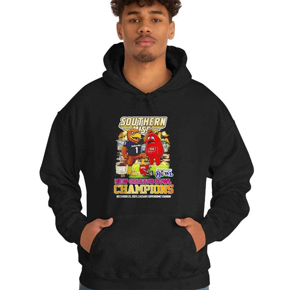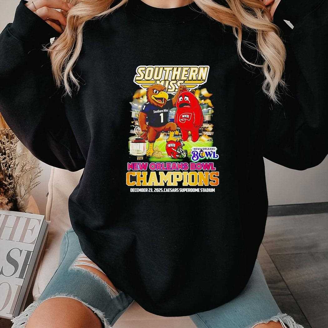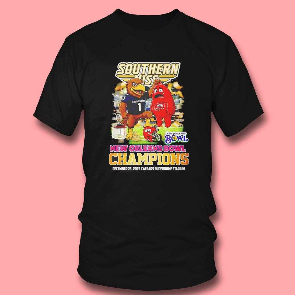 Commemorate a historic victory for the Black and Gold with the official New Orleans Bowl Champions tee! This design celebrates the Southern Miss Golden Eagles’ triumphant win over Western Kentucky, featuring a celebratory trophy graphic and the iconic eagle mascot in high-energy action. The vibrant gold and black color scheme honors the school’s heritage, creating a professional and polished look for students, alumni, and fans. This shirt is a must-have keepsake for those who witnessed the team’s grit in the Big Easy. Crafted from a high-performance cotton blend, it provides a comfortable, athletic fit and exceptional durability. The high-definition screen print is designed to remain sharp and vivid through every wash, ensuring the memory of the win stays bright for years. Represent the pride of Hattiesburg and wear the glory of the bowl win everywhere you go. Go Eagles! Relive the victory and roar for the Eagles—secure your Southern Miss Golden Eagles Beat Western Kentucky New Orleans Bowl Champions Tee right now!. T-shirt !