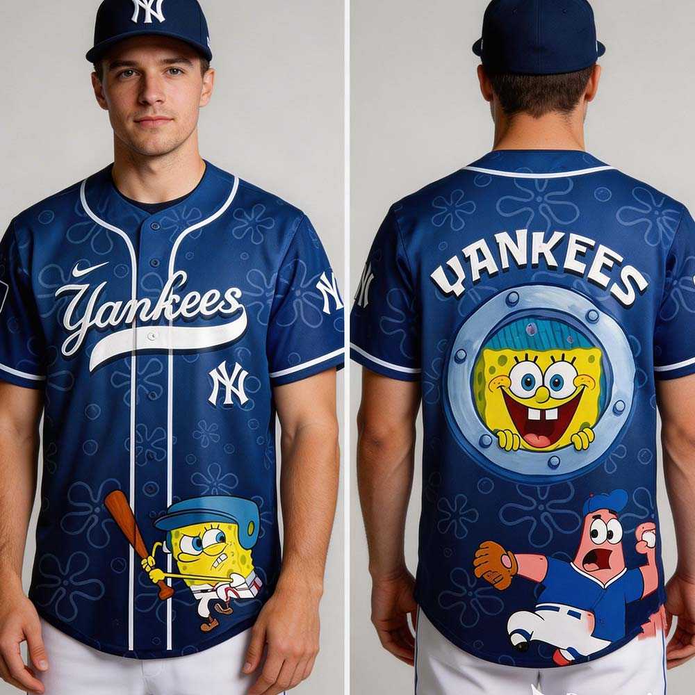 Get ready to hit a grand slam with the **SpongeBob SquarePants MLB All Teams Home Run Baseball Jersey**! This hilarious collection playfully merges the whimsical world of Bikini Bottom with America’s favorite pastime. Each design showcases vibrant team colors, from Dodgers blue to Phillies red and Yankees navy, featuring two distinct styles: one sports a circular porthole framing SpongeBob’s cheerful face, with a mischievous Patrick peeking from below; the other transforms into a classic baseball jersey, adorned with bold team names and a determined SpongeBob in a cap, mid-swing with a baseball bat. The humor springs from seeing our beloved, absorbent friend so earnestly engaged in MLB action, creating an irresistible blend of sports enthusiasm and cartoon charm.
