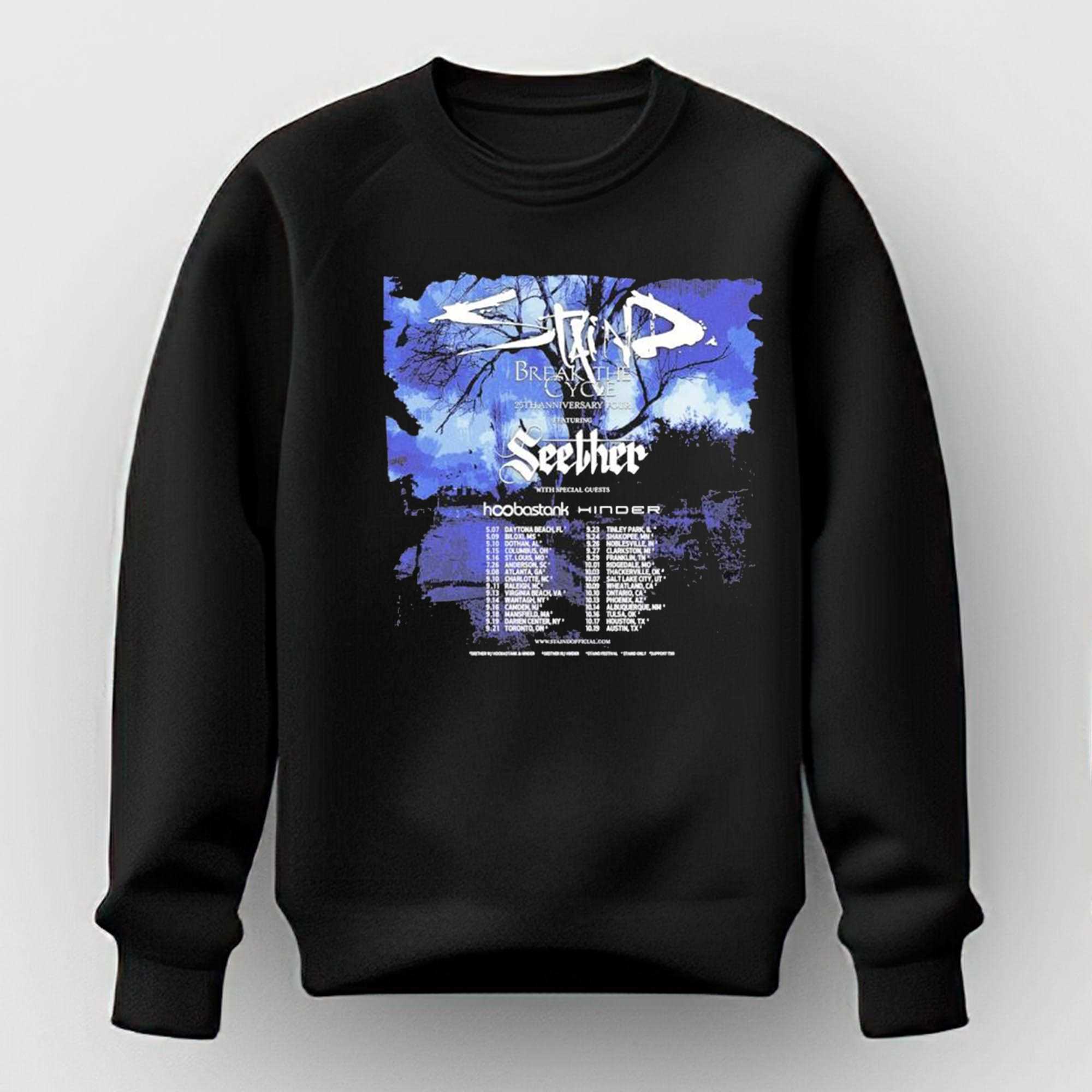 Relive the raw intensity and the emotional depth of a generation-defining album with the Staind Celebrating 25 Years Of Break The Cycle Tour Poster Tee. This design is a gritty and authoritative tribute to the 2001 masterpiece, featuring a visual tour-poster style graphic that captures the moody aesthetic of the “Aaron Lewis” era. The artwork utilizes a high-contrast palette of deep blacks, whites, and oranges, listing the iconic tracks that helped millions navigate their struggles. This isn’t just a band shirt; it’s a badge of honor for the fans who found solace and strength in the lyrics of “It’s Been Awhile” and “Outside.” The distressed typography and atmospheric imagery create a look that is both nostalgic and rebelliously stylish. Crafted from heavyweight, premium 100% cotton, it provides a structured fit and long-lasting durability for those who still stand with the band. The fabric is soft-washed for a comfortable, “broken-in” feel that reflects the authenticity of the nu-metal scene. Every detail of the tour branding and the album artwork is captured with precision in the screen print, ensuring your support for the legacy is unmistakable. Whether you’re heading to a reunion show or just showing off your impeccable taste in rock history, this shirt ensures you look the part. Honor the music that changed your life and keep the spirit of the cycle alive. Secure your gear and buy the Staind Celebrating 25 Years Of Break The Cycle Tour Poster Tee now!.