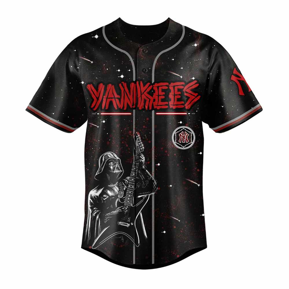 - Introducing the Star Wars Yankees Vader Dark Side Heavy Metal Baseball Jersey , the perfect addition to any fan’s collection! Dominate the diamond with the imperial might of the Star Wars Yankees Vader Dark Side Heavy Metal Baseball Jersey! This imposing design flawlessly combines the fearsome presence of Darth Vader with the legendary pinstripes of the New York Yankees. Featuring a striking, heavy metal-inspired graphic of Vader, meticulously integrated into a classic baseball uniform, this jersey is a true declaration of power. The iconic Yankees logo ensures your team loyalty is boldly displayed. It’s the ultimate gear for fans who appreciate both epic narratives and championship teams. Unleash the power of the Empire! Get your Star Wars Yankees Vader: Empire’s Pinstripes jersey and rule the fashion galaxy!.