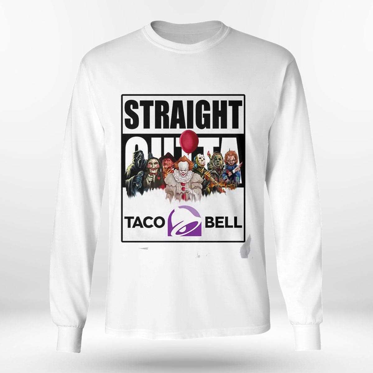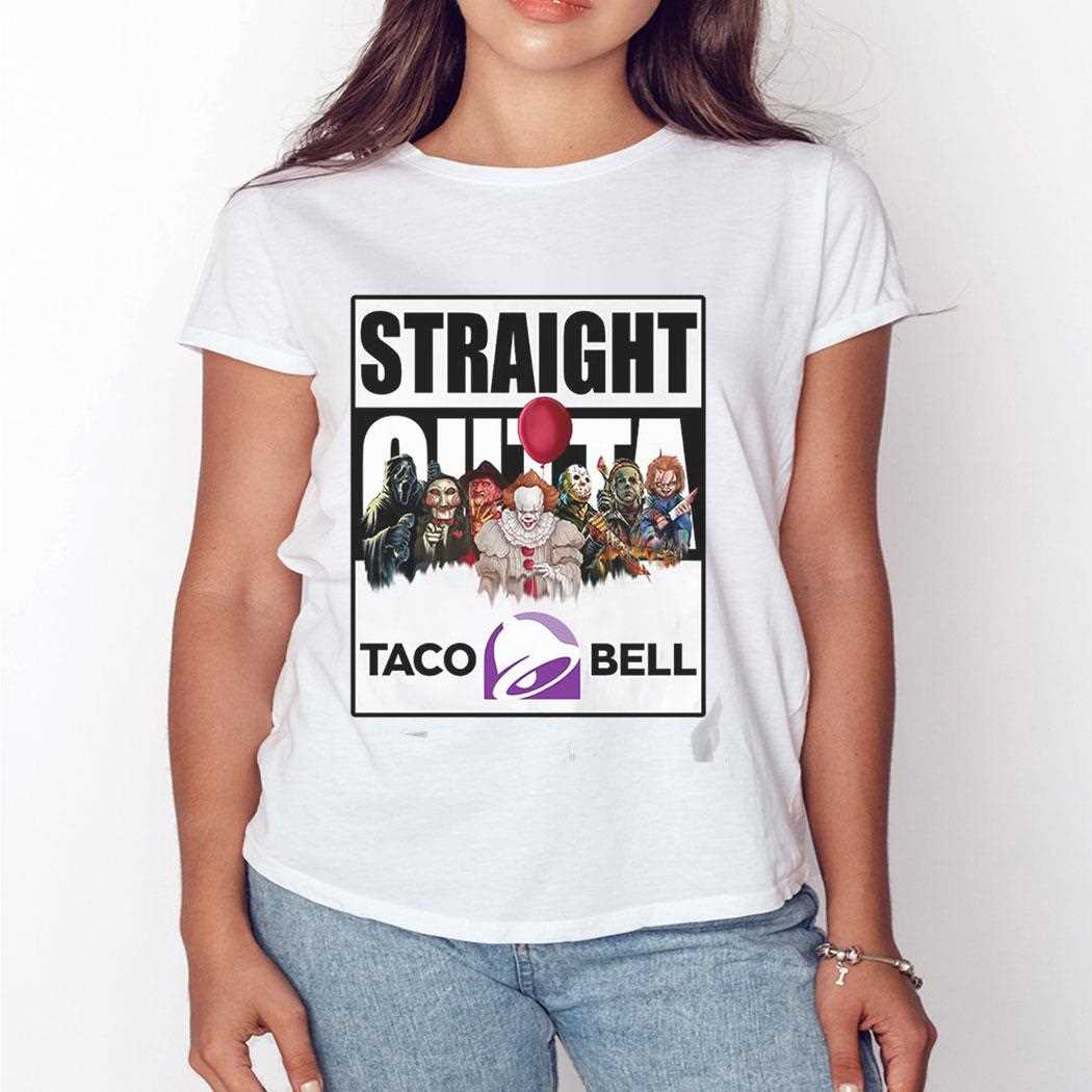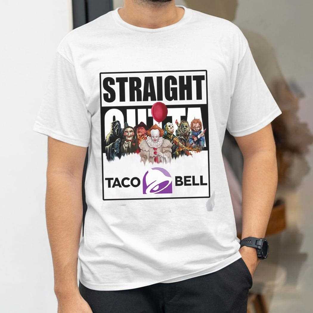 Live más with a side of terror with our Straight Outta Taco Bell Terror Team Tee! This vibrant yet chilling design features the “Straight Outta” text above a vividly depicted Taco Bell restaurant. The familiar purple and pink glow is replaced with an eerie, flickering light, revealing shadowy figures of a “terror team” lurking around the drive-thru. The Taco Bell logo is cleverly integrated into this fast-food horror landscape. This soft, comfortable tee is perfect for fans of both Taco Bell and horror, making it a unique addition to any casual wardrobe. It’s a spicy blend of flavor and fear. Spice up your scares! Get your Straight Outta Taco Bell Terror Team Tee and join the frightful fiesta!. T-shirt !