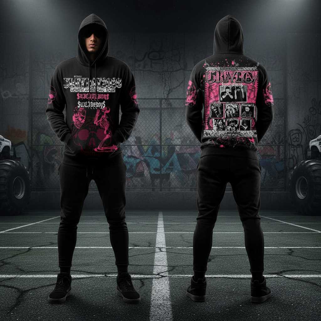 Unleash your inner fan with the **Suicideboys Grey Day Tour 2026 G59 Records Shirt Hoodie**, a striking piece that captures the raw energy of the Grey Day aesthetic. This all-over print design commands attention with its dark, edgy charm. The front features bold, distressed white text proclaiming “GREY DAY 2026 NORTH AMERICAN TOUR” atop a vibrant hot pink, layered “SUICIDEBOYS” typography. Below, a skeletal pink skull and ribcage graphic emerge from the bottom, flanked by energetic pink splatters and subtle skull motifs extending onto the sleeves. The back explodes with a large pink panel, crowned by “G*59 RECORDS” in distressed white, showcasing a grid of nine monochromatic album art or band photos, all encased within a grunge-inspired frame of pink paint splatters and textures, creating a visually rich and unapologetic statement.