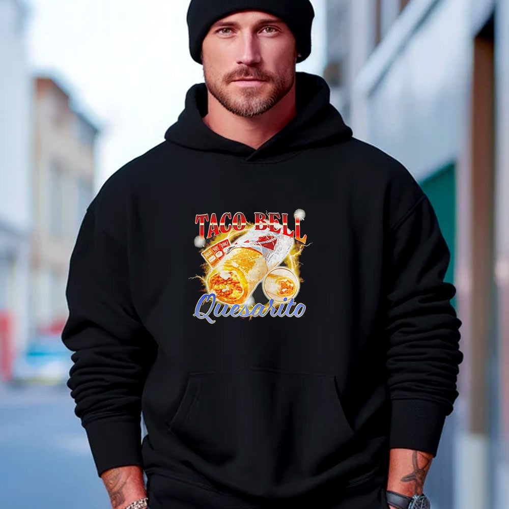 Pay homage to a legendary menu item with this nostalgic and high-energy Taco Bell tribute. The design features the iconic purple, pink, and yellow bell logo reimagined for the 2020s, paired with a mouth-watering graphic of the beloved Quesarito. The typography is bold and modern, capturing the fast-food giant’s signature “Live Mas” spirit. This shirt is a must-have for foodies and pop-culture enthusiasts who mourn the loss of their favorite drive-thru staples. Crafted from a premium cotton-poly blend, it provides a soft, flexible fit that’s perfect for casual outings or late-night snack runs. The vibrant inks pop against the charcoal black fabric, creating a professional look that transcends standard fan gear. With reinforced shoulder-to-shoulder taping, this garment is built for comfort and durability. It’s a fun, lighthearted way to show your love for the brand that defined late-night dining for a generation. Whether you’re a long-time fan or a collector of brand-inspired fashion, this tee is a certified standout. Celebrate your favorite fast-food legacy and “Live Mas” in style—order your Taco Bell Quesarito Tee today!.