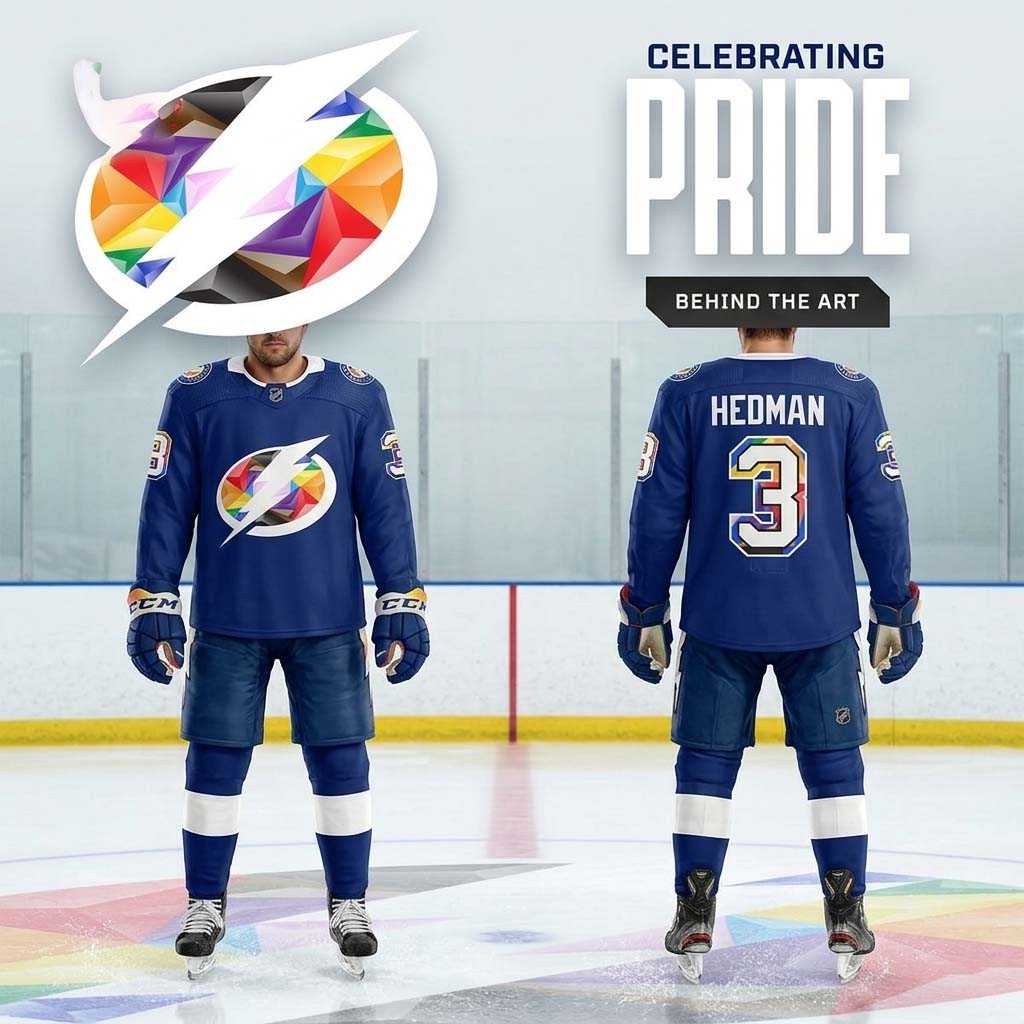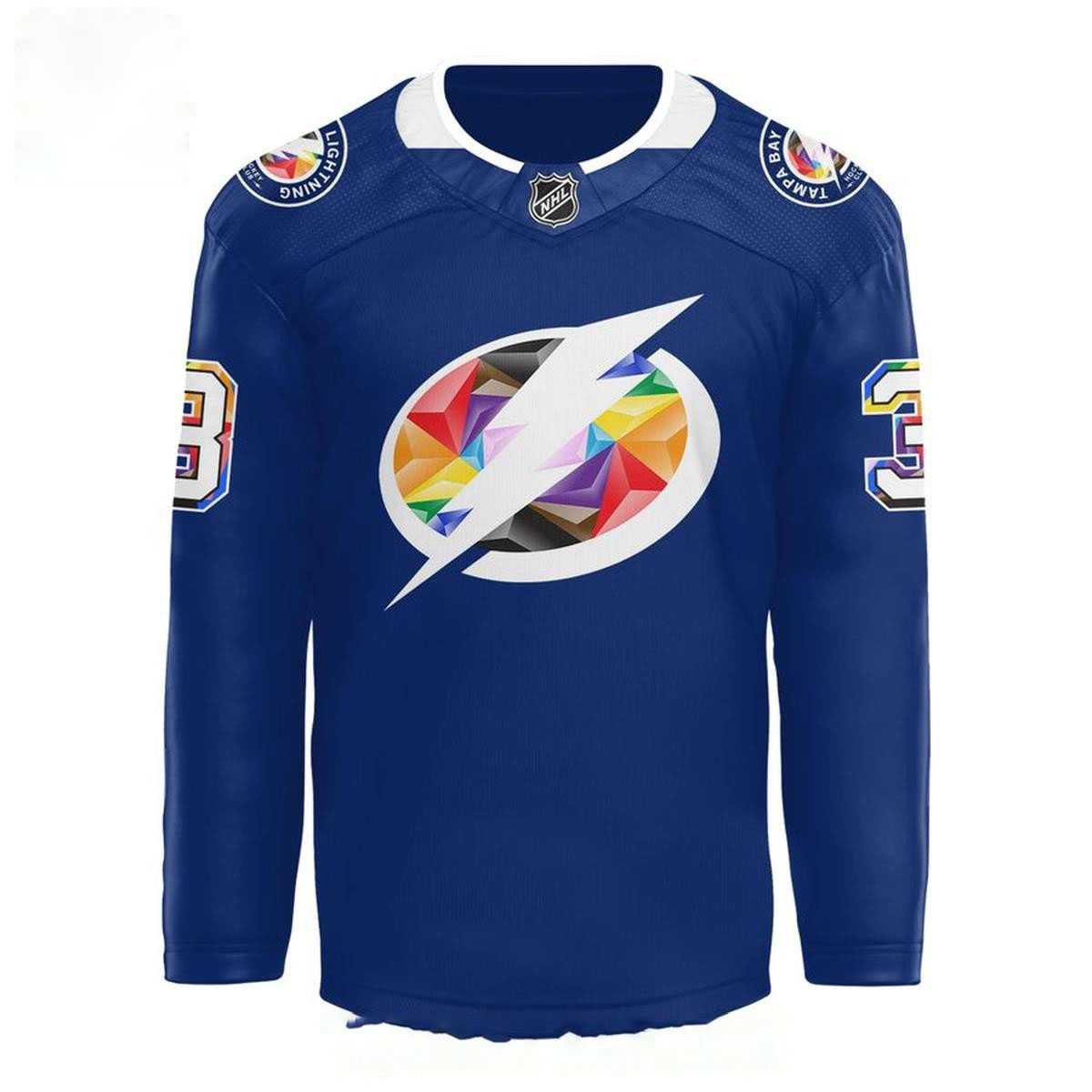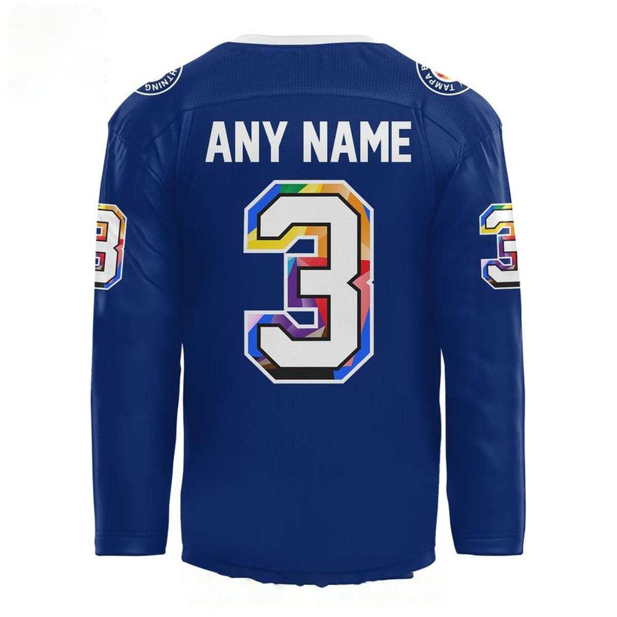 Unleash your vibrant spirit with the **Tampa Bay Lightning Pride Night 2026 Custom Hockey Jersey**! This show-stopping blue jersey electrifies fandom by featuring the iconic Lightning bolt, dramatically filled with a brilliant, multi-segmented rainbow pattern that radiates joy and inclusivity, set against a crisp white oval. Complementing this stunning front design, the back proudly displays “ANY NAME” above a large, custom number “3”, also adorned with the same festive, colorful geometric segments, framed by crisp white and black outlines. Circular “TAMPA BAY LIGHTNING” shoulder patches complete the look, celebrating unity and the team’s unwavering commitment to the LGBTQ+ community. It’s a powerful statement piece, blending the fierce energy of hockey with the joyous spectrum of Pride.