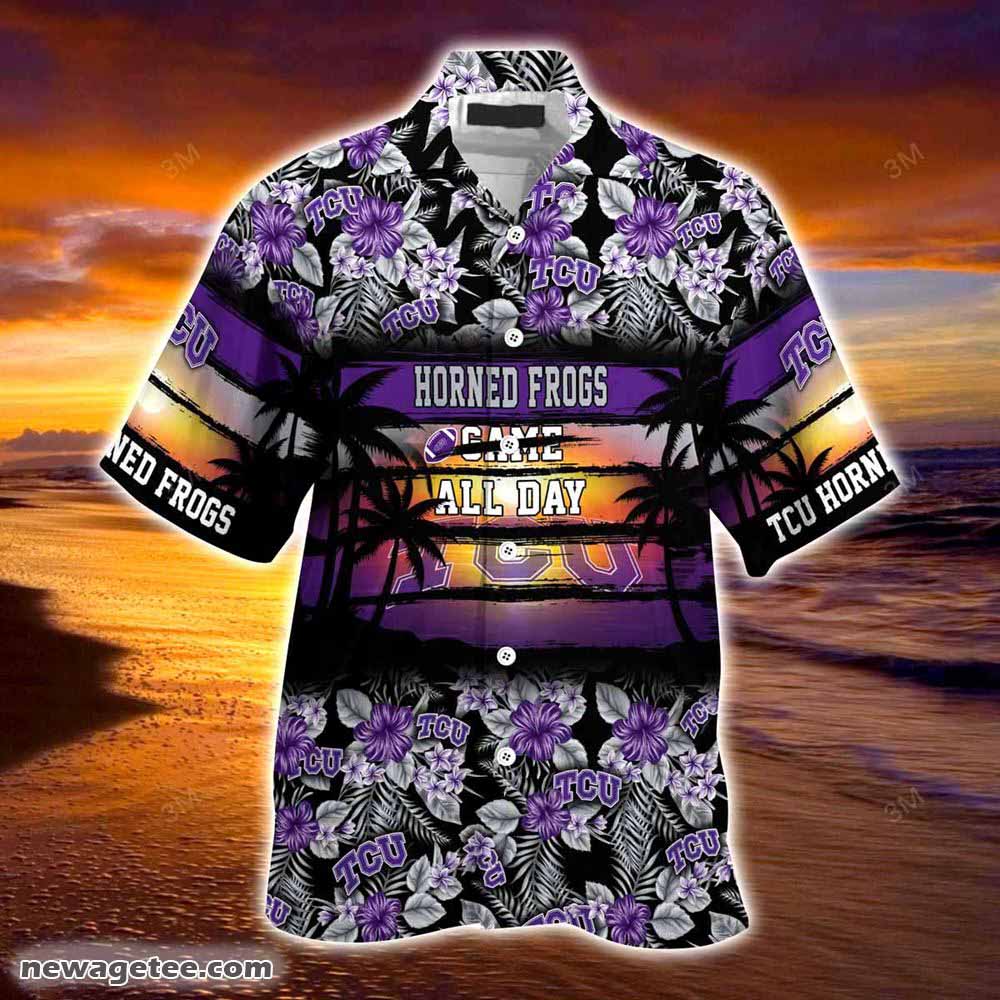 - Our Tcu Horned Frogs Summer Beach Hawaiian Shirt Hibiscus Pattern For Sports Fan is made of kate silk-polyester fabric, the Short Sleeve Hawaiian Beach Shirt boasts remarkable durability, insulation, and wrinkle resistance. Elevate your summer wardrobe with this versatile shirt that’s ideal for laid-back excursions, romantic rendezvous, and sun-soaked beach gatherings. Its adaptable style renders it suitable for a range of occasions, making it an exceptional pick for festive events such as Christmas, birthdays, parties, and housewarming presents.