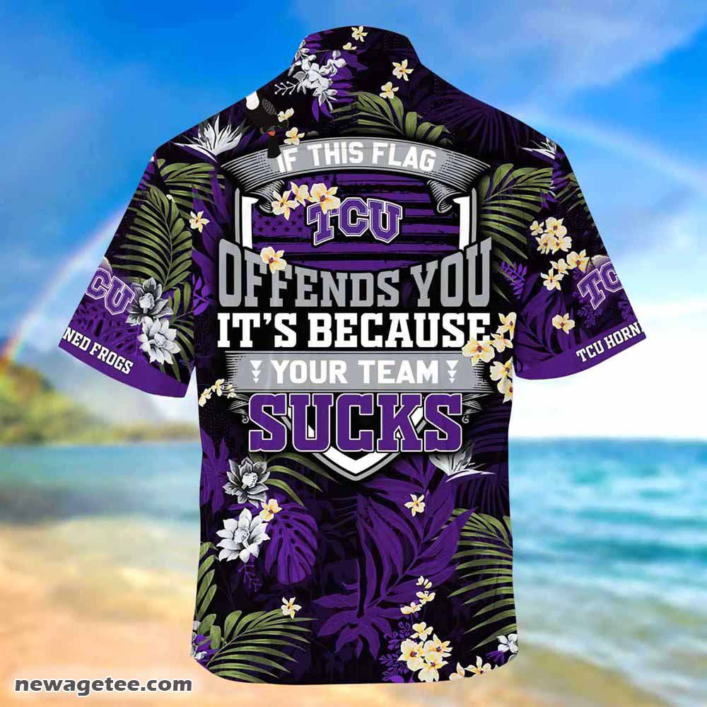 - Our Tcu Horned Frogs Summer Beach Hawaiian Shirt This Flag Offends You is made of kate silk-polyester fabric, the Short Sleeve Hawaiian Beach Shirt boasts remarkable durability, insulation, and wrinkle resistance. Elevate your summer wardrobe with this versatile shirt that’s ideal for laid-back excursions, romantic rendezvous, and sun-soaked beach gatherings. Its adaptable style renders it suitable for a range of occasions, making it an exceptional pick for festive events such as Christmas, birthdays, parties, and housewarming presents.