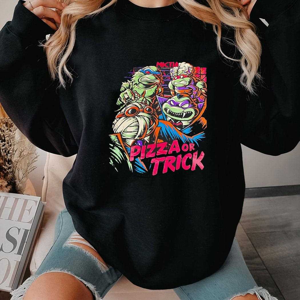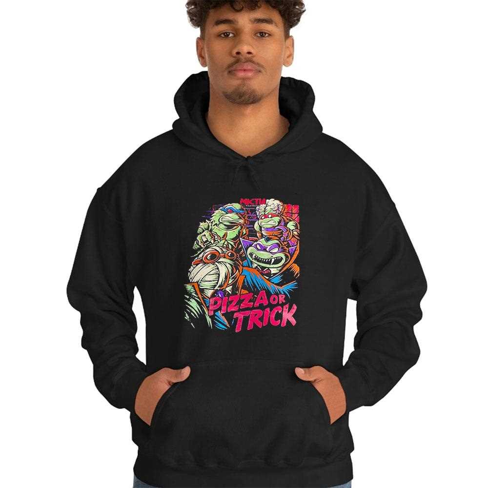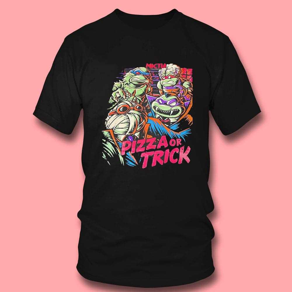 Combine 90s cartoon nostalgia with spooky season vibes in this hilariously fun TMNT tribute. The design features Leonardo, Donatello, Michelangelo, and Raphael ready for Halloween, delivering their ultimate ultimatum: “Pizza Or Trick!” The artwork utilize a vibrant, retro color palette that honors the classic animated series, set against a professional black background to make the action pop. This tee is an absolute must-have for fans of the “Heroes in a Half Shell” who want to showcase their playful spirit during the fall months. Crafted from a soft, breathable cotton blend, it provides all-day comfort for candy hunting or turtle-watching. The print is soft to the touch and designed to stay bright, ensuring your favorite ninjas look as good as ever. It’s a unique, joyful piece that brings a smile to fans of all ages. Celebrate Halloween turtle-style—grab your Teenage Mutant Ninja Turtles Pizza Or Trick Tee right now!. T-shirt !