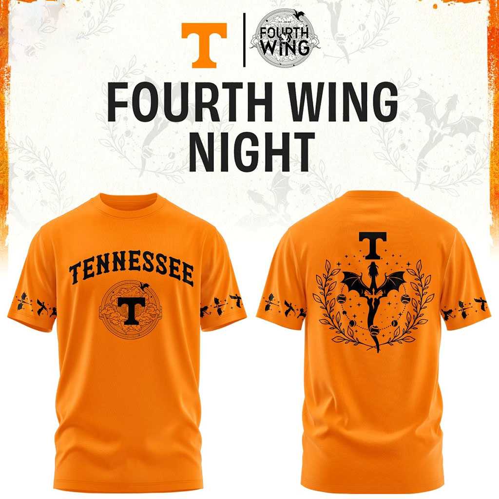 Dare to stand out with the Tennessee Volunteers Fourth Night 2026 NCAA Football Hoodie Tee! This vibrant orange garment redefines team spirit with an intriguing, gothic twist. The front showcases “TENNESSEE” in bold black, arched above a prominent “T” and a subtle circular crest. Both sleeves feature a repeating pattern of sleek black bat-like creatures, adding a mysterious flair. On the back, another bold black “T” is positioned above a stunning, intricately detailed winged creature, complete with a trident-like tail, dramatically framed by a circular wreath. This unique design playfully embraces a “Fourth Night” theme, celebrating your Volunteers pride with unforgettable mystique.