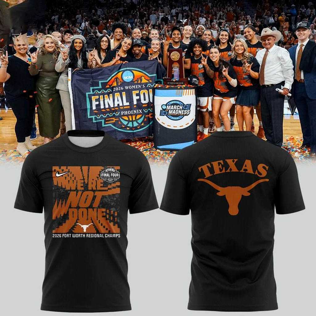 Celebrate victory and fuel anticipation with the Texas Longhorns 2026 NCAA Women’s Basketball Tournament Final Four Shirt Hoodie. This striking black apparel boldly proclaims the team’s relentless spirit with an aggressive, distressed orange graphic on the front that dramatically declares “WE’RE NOT DONE!” The design features a pixelated orange and black background, subtly incorporating a white Nike swoosh at the top left and a detailed white and orange “FINAL FOUR” logo at the top right, signifying their next goal. Below the powerful declaration, a crisp white Texas Longhorns logo sits proudly above “2026 FORT WORTH REGIONAL CHAMPS” in white, perfectly capturing the exhilaration of their regional triumph and unwavering ambition. The back features a large, iconic orange “TEXAS” text with the classic Longhorns silhouette underneath, radiating pure team pride.