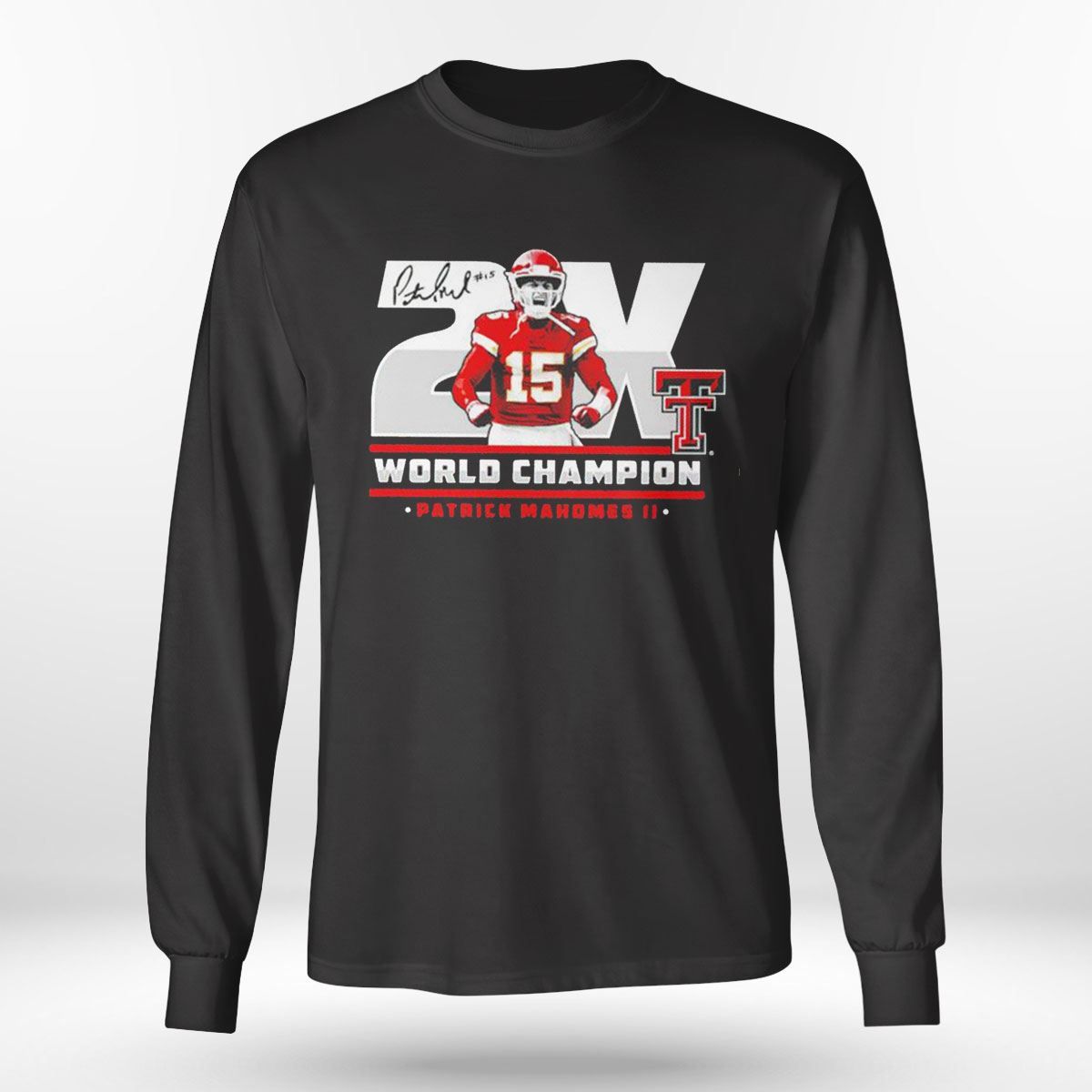 Texas Tech Red Raiders Patrick Mahomes Ii 2x World Champion Flex Signature Longsleeve T-shirt Shirt Longsleeve T-shirt is a stylish, comfy shirt. Made of 100% cotton, it is cool and soft and keeps you cool in summer days. This edgy shirt comes in different colors, but the black stands out the most and matches with everything. It has many uses like casual wear, party wear, office wear and much more. Product details: