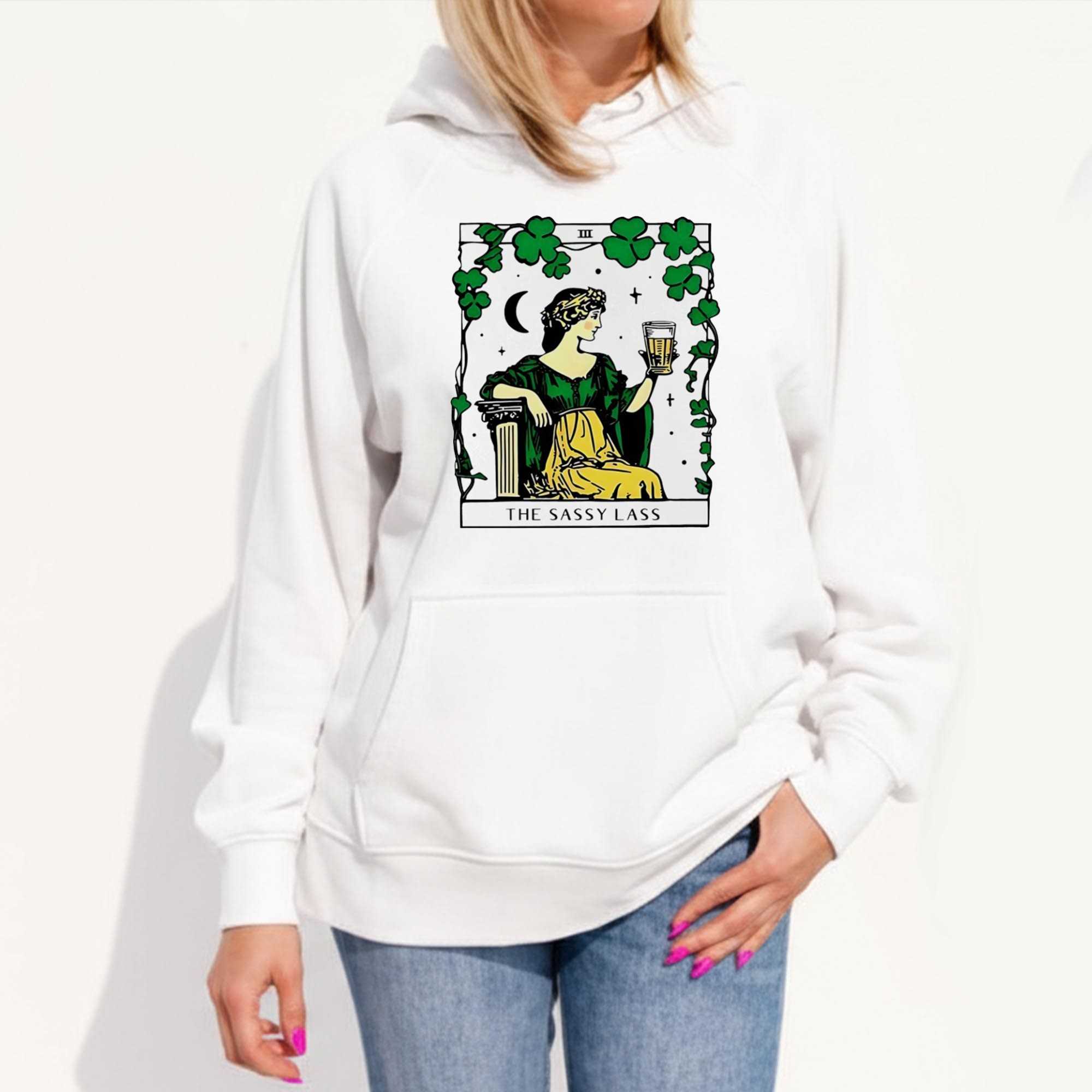 Whether celebrating with a pint or simply embracing your inner “Sassy Lass,” this unique design is available across a versatile range of apparel. Choose from our T-shirt, Hoodie, Long Sleeve, Sweatshirt, Tank Top, or V-Neck styles. Each option lets you showcase your playful spirit in the perfect form. Don’t miss out on embodying the abundance and joy of The Sassy Lass St Patricks Day Tarot card T-Shirt this St. Patrick’s Day or any day. Embody good fortune and good cheer – Add to Cart now and let your sassy side shine!