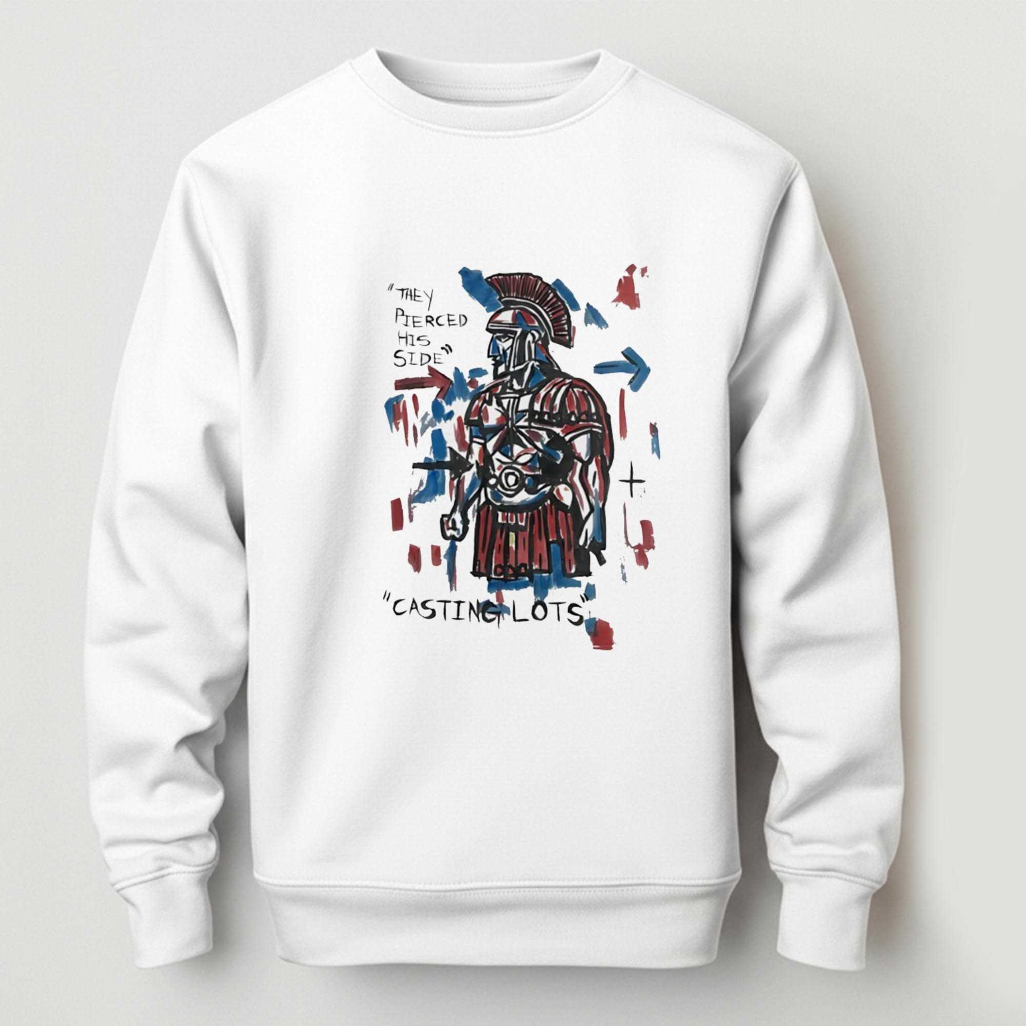 Step into a conversation starter with our ‘They Pierced His Side Casting Lots Tee’. This remarkable design features a bold, almost abstract depiction of a Roman centurion or soldier, rendered in dynamic brushstrokes of red and blue, outlined in stark black against a clean white background. Above his left shoulder, the hand-drawn text ‘THEY PIERCED HIS SIDE’ is strategically placed, with vivid red and blue arrows, plus a prominent black arrow, pointing directly to his side. A subtle black cross also appears on the right. Below, ‘CASTING LOTS’ is scribbled in a similar style, encapsulating the historical narrative with an edgy, artistic flair. This shirt brilliantly fuses ancient history with contemporary street art, offering a unique visual commentary that’s both striking and thought-provoking.
