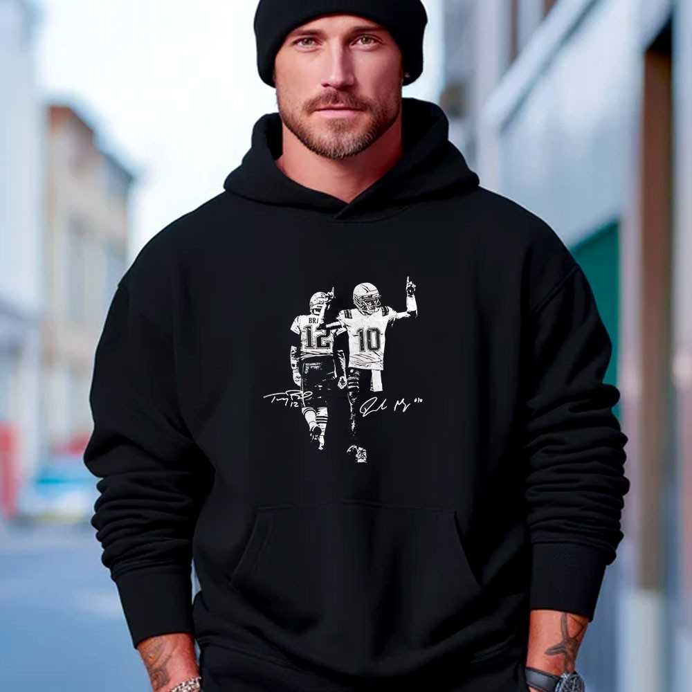 Experience the passing of the torch in Foxborough with this exclusive Tom Brady and Drake Maye tribute. The design masterfully juxtaposes the legacy of the “GOAT” with the potential of the new era, featuring high-resolution artistic renditions of both quarterbacks in their iconic Patriots uniforms. The navy, red, and silver color scheme is a proud celebration of a championship pedigree. This is the ultimate “Game Day” gear for the fans who carry the history of the six rings while cheering for the future of the franchise. Crafted from a soft-wash, mid-weight cotton, this tee provides a comfortable, athletic fit that’s perfect for the stands at Gillette Stadium or a backyard tailgate. The digital print is integrated into the fabric for a soft-hand feel that won’t fade. It’s a soulful and sophisticated piece that connects the golden age of the dynasty to the next exciting chapter. Celebrate the past and cheer for the future of New England—buy your Tom Brady Drake Maye New England Patriots Football Game Day Tee right now!.
