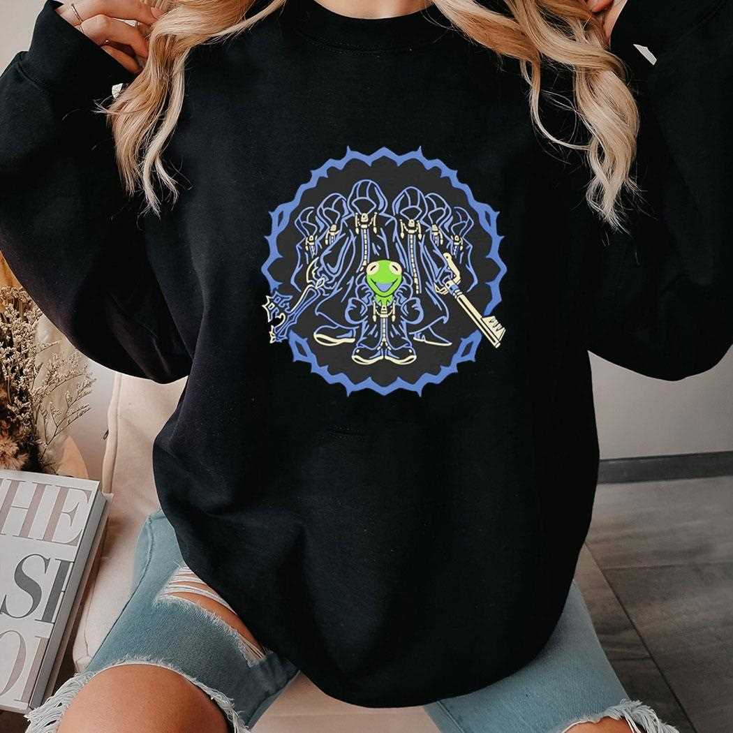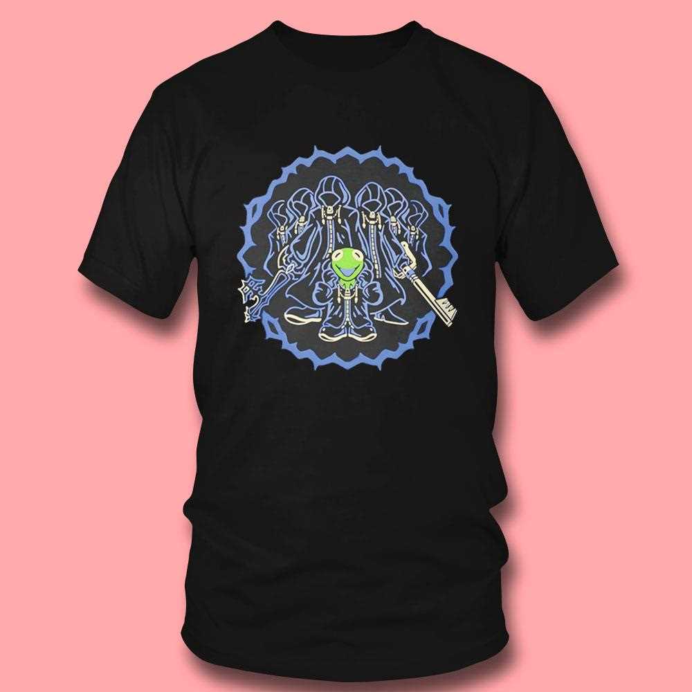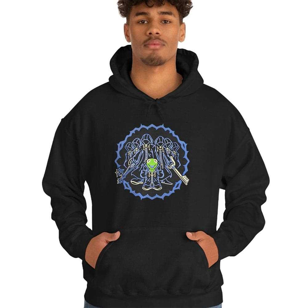 For fans of the legendary crossover RPG series, this shirt is a portal back to the emotional and complex world of Kingdom Hearts. The design is a stunning, circular emblem that feels like a stained-glass window into the soul of the game. At the center, we see a stylised depiction of a character (likely a Heartless or a version of Riku/Sora in a cloak) surrounded by the iconic blue flames and magical aura that permeates the series.