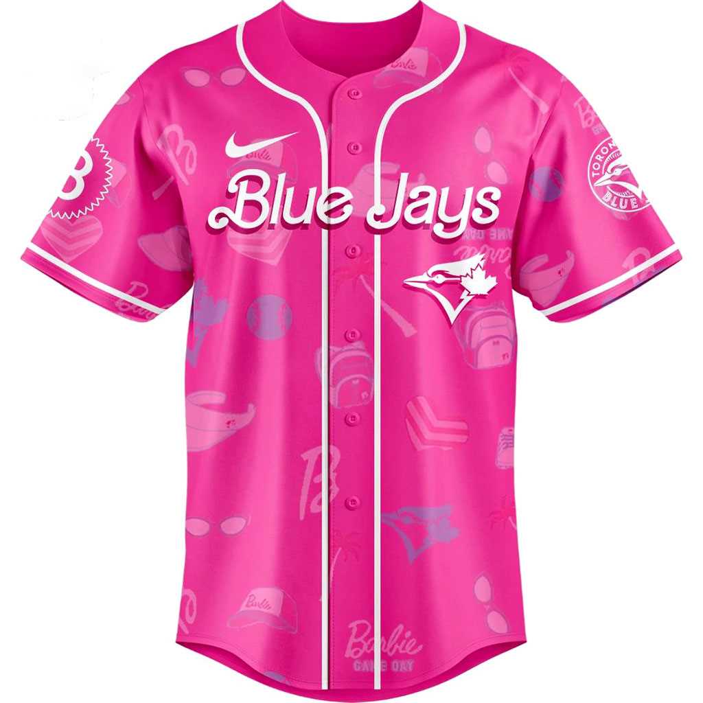Step up to the plate in ultimate style with our Toronto Blue Jays Barbie Pink Baseball Jersey! This eye-catching hot pink jersey is a playful fusion of two iconic worlds. The front proudly displays “Blue Jays” in crisp white script, accented by the team’s white bird logo and a Nike swoosh, all framed by a classic white full-button placket. The background subtly features an array of Barbie-themed elements like high heels, handbags, and “Barbie” logos in a lighter pink, creating a delightful pattern. Turn heads as you walk away, revealing “Toronto” in elegant white script across the back, above a stunning white oval frame enclosing Barbie’s classic silhouette, with another “Barbie” logo boldly underneath. This design perfectly captures the unexpected joy of combining sporty fandom with a splash of glamorous, nostalgic fun.