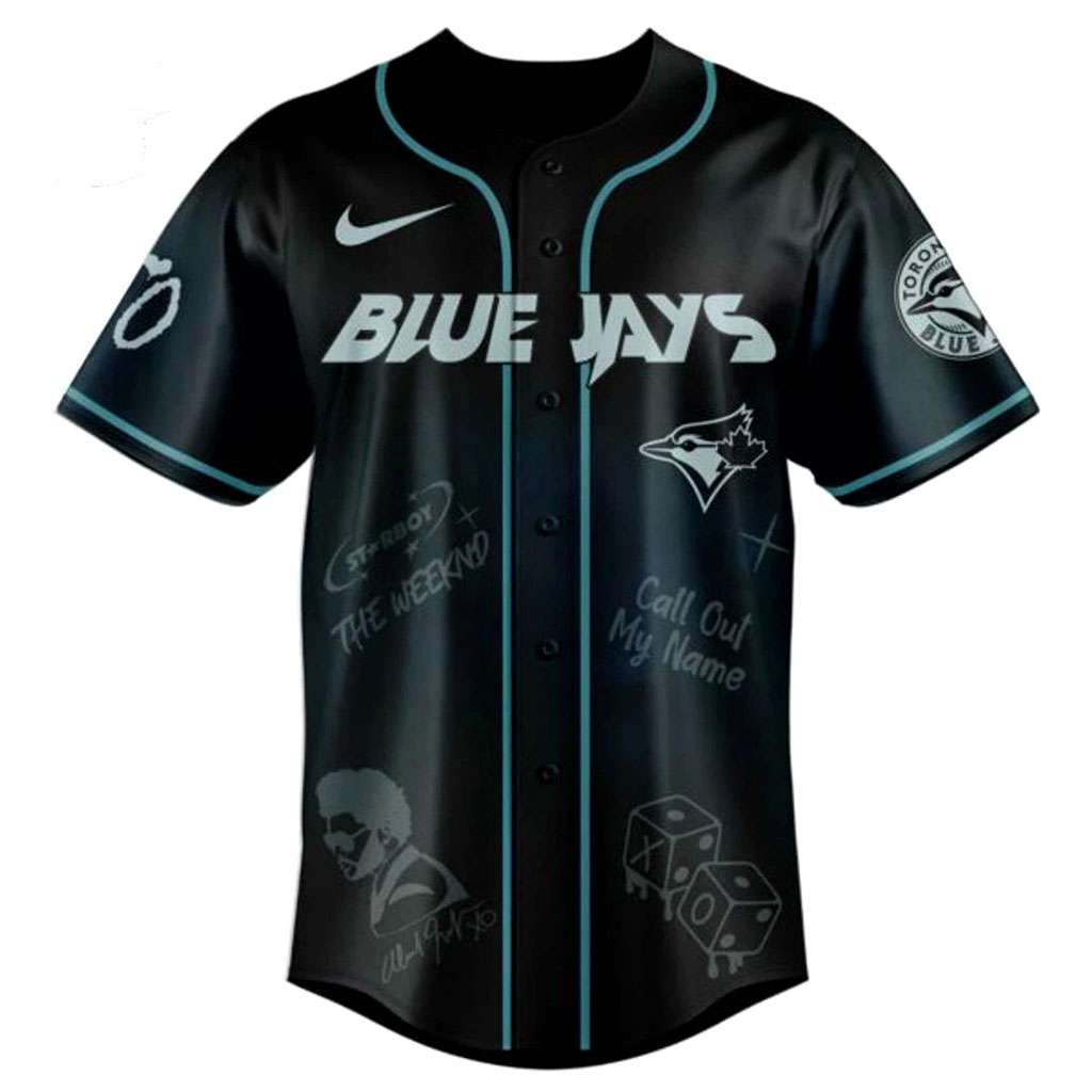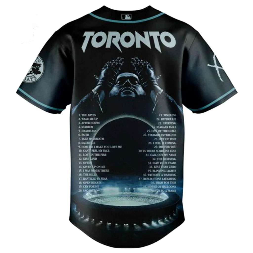 Hit a home run for your style with the Toronto Blue Jays Weekend After Hours Till Dawn Baseball Jersey! This striking black jersey, featuring light blue piping and button details, masterfully blends the nocturnal allure of The Weeknd’s “After Hours Till Dawn” tour with iconic Blue Jays spirit. The front proudly displays “BLUE JAYS” in white with a light blue outline, the team’s bird logo, and scattered tour graphics like “STARBOY,” artist silhouettes, dice, and signatures. The back hits hard with a bold “TORONTO” above The Weeknd’s distinctive album art – hands cupping face – set against an illuminated stadium, complete with an extensive tracklist. This design cleverly captures the electrifying spirit of merging a legendary music tour with Canada’s beloved baseball team.