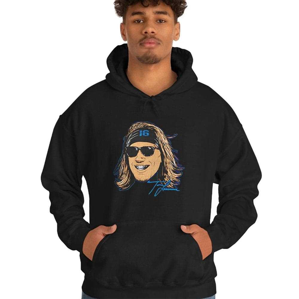 Experience the ultimate “Duval” swagger with this one-of-a-kind Trevor Lawrence tribute! The design features a stylized, artistic close-up of the Jaguars’ star quarterback, complete with cool sunglasses and “grill swag” that reflects his effortless confidence and the team’s vibrant energy. The use of teal, black, and gold accents creates a high-contrast visual that is both modern and edgy. It’s the perfect apparel for fans who love Trevor’s personality as much as his passing game. Made from a high-grade cotton-poly blend, this shirt provides a soft feel and a flexible fit that moves with you through every game-day celebration. The high-definition digital print captures every strand of his iconic hair and the shine of the swag. Stand out from the sea of standard jerseys with a look that is uniquely Jacksonville. Represent the future of Duval with a bold new look—grab your Trevor Lawrence Jacksonville Jaguars Grill Swag Head Tee now!. T-shirt !