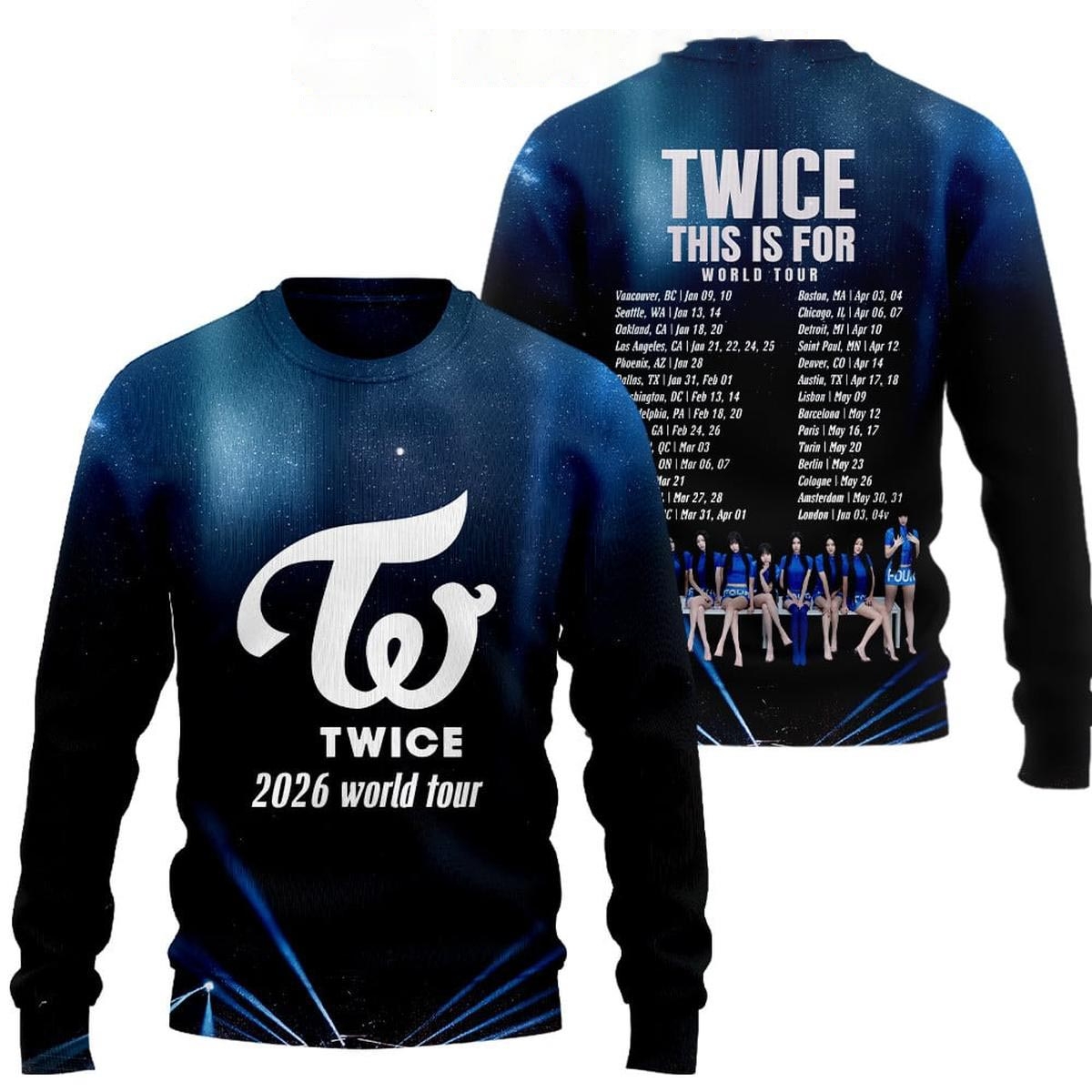 > Step into the cinematic world of the XO universe with “The Weeknd” 2026 After Hours Til Dawn tour hoodie. The design features a massive, neon-lit graphic of Abel Tesfaye in his iconic red suit, surrounded by futuristic cityscapes and cosmic motifs. The back is a detailed chronicle of the 2026 stadium tour, listing every city in a sleek, digital-inspired font. Utilizing a vibrant palette of blood red, electric blue, and gold, this piece captures the high-energy and moody atmosphere of his live show. Made from a premium, moisture-wicking fabric, it provides all-day comfort for the most intense concerts. The hood is double-layered and the drawstring features custom metallic tips for a high-end finish. It’s the ultimate souvenir for the XO family. Join the global tour and represent the king of modern R&B—secure your The Weeknd After Hours Til Dawn 2026 Tour Tee Hoodie-1 today!. Our Twice This Is For World Tour 2026 Tee Hoodie meets all of your needs: it’s warm and cozy, lightweight and roomy, and built to last. It features dropped shoulders and a standard fit to offer a high level of comfort and ease of movement.