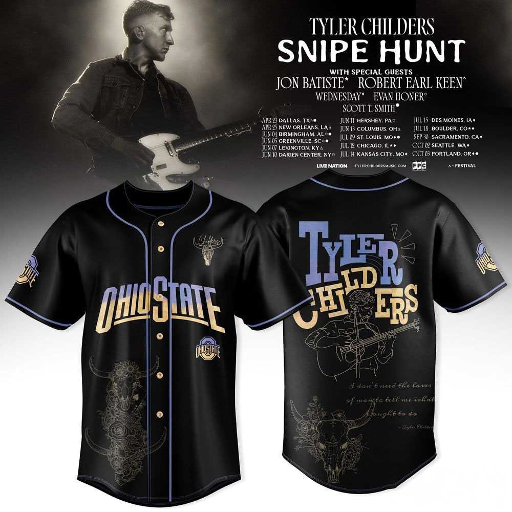 Unleash your inner fan with the **Tyler Childers Ohio State Buckeyes 2026 Snipe Hunt Jersey**, a unique garment fusing country cool with collegiate spirit. This black, baseball-style jersey, accented with vibrant blue piping, boldly displays “OHIO STATE” across the chest in a dynamic cream and light blue gradient font, nestled above an intricate bull skull and circular OSU logo. Look closer, and you’ll spot subtle “Childers” antlers near the shoulder. The back explodes with a majestic “TYLER CHILDERS” in bold blue and gold letters, complemented by a rustic line art guitarist, and heartfelt lyrics, all framed by another detailed bull skull design. This design isn’t just clothing; it’s a witty, tongue-in-cheek celebration, a playful “snipe hunt” into a fantastical future where Appalachian folk meets Big Ten fandom, promising a legendary, imaginary, crossover event in 2026.