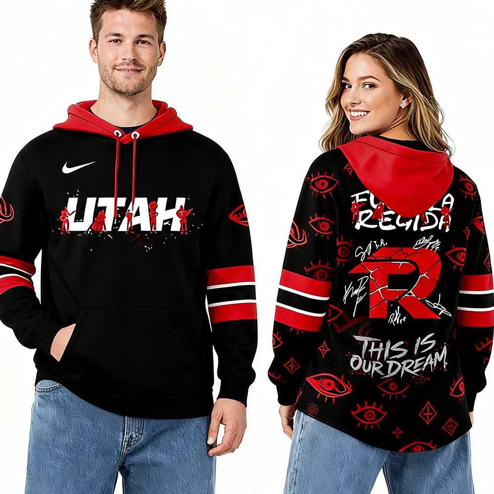 Prepare to roar with the Utah Mammoth Fuerza Regida This is our Dream 2026 Tour Hoodie! This dynamic black and red garment masterfully combines fierce regional pride with ultimate fan dedication. The front proudly displays ‘UTAH’ in bold, distressed white, cleverly formed by red silhouettes of band members, complete with a white swoosh and surrounded by abstract red eye and gear-like patterns. Striking red and white stripes adorn the sleeves, while a vibrant red hood and drawstrings complete the athletic-inspired look, evoking the power of a mammoth. The back boldly features ‘FUERZA REGIDA’ in distressed white over red figures, dominating a large, cracked red ‘R’ embellished with authentic-looking signatures, all crowned by ‘THIS IS OUR DREAM’ in distressed white. It’s a spirited, unique design that playfully imagines Fuerza Regida as Utah’s most legendary, stadium-touring ensemble, blending music and a powerful team aesthetic.