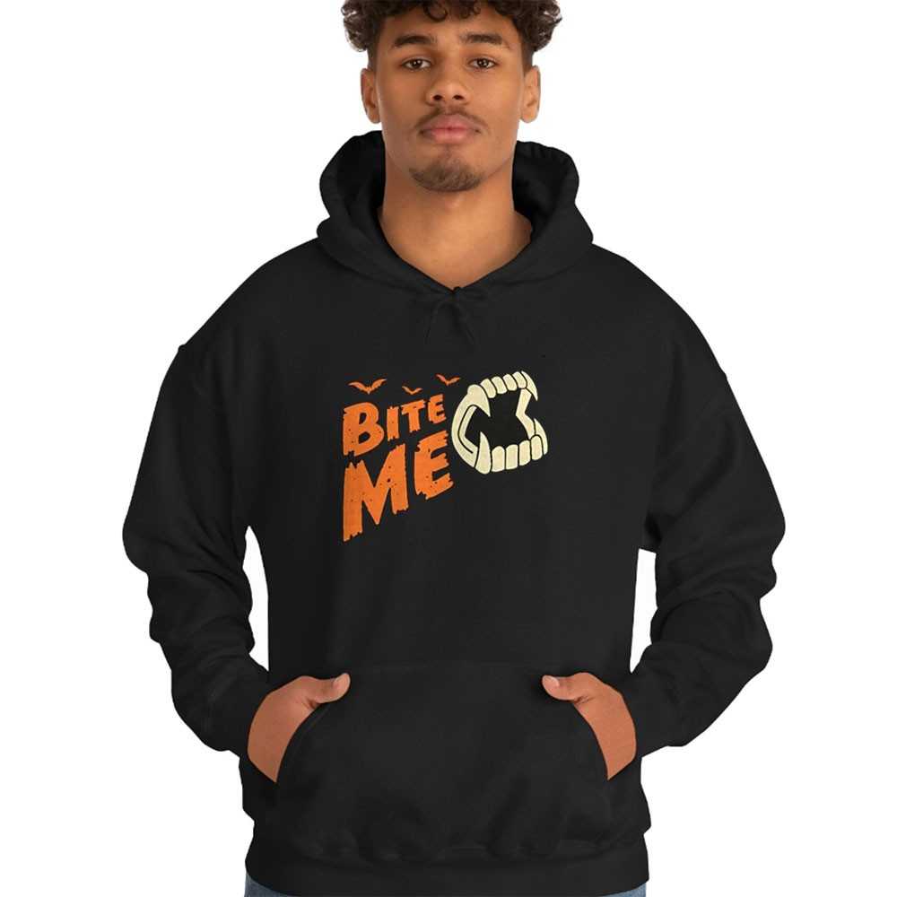 Inject some playful spookiness into your casual wear. This design uses bold, comic-book style typography in vibrant orange and yellow to deliver a cheeky message. It’s a fun, retro take on vampire lore that’s great for Halloween or any day you’re feeling a bit bitey. Don’t miss out on this fan-favorite—secure your Vampire Bite Me Tee right here!.