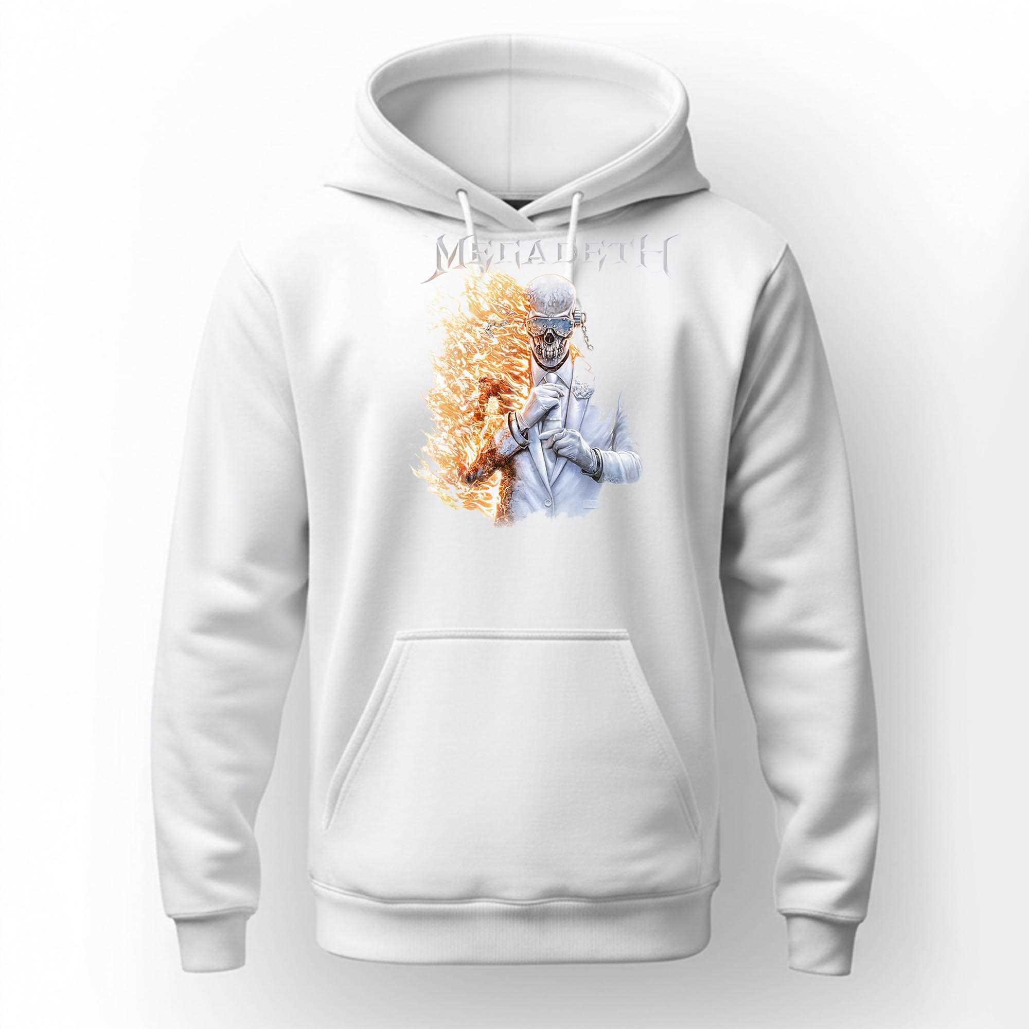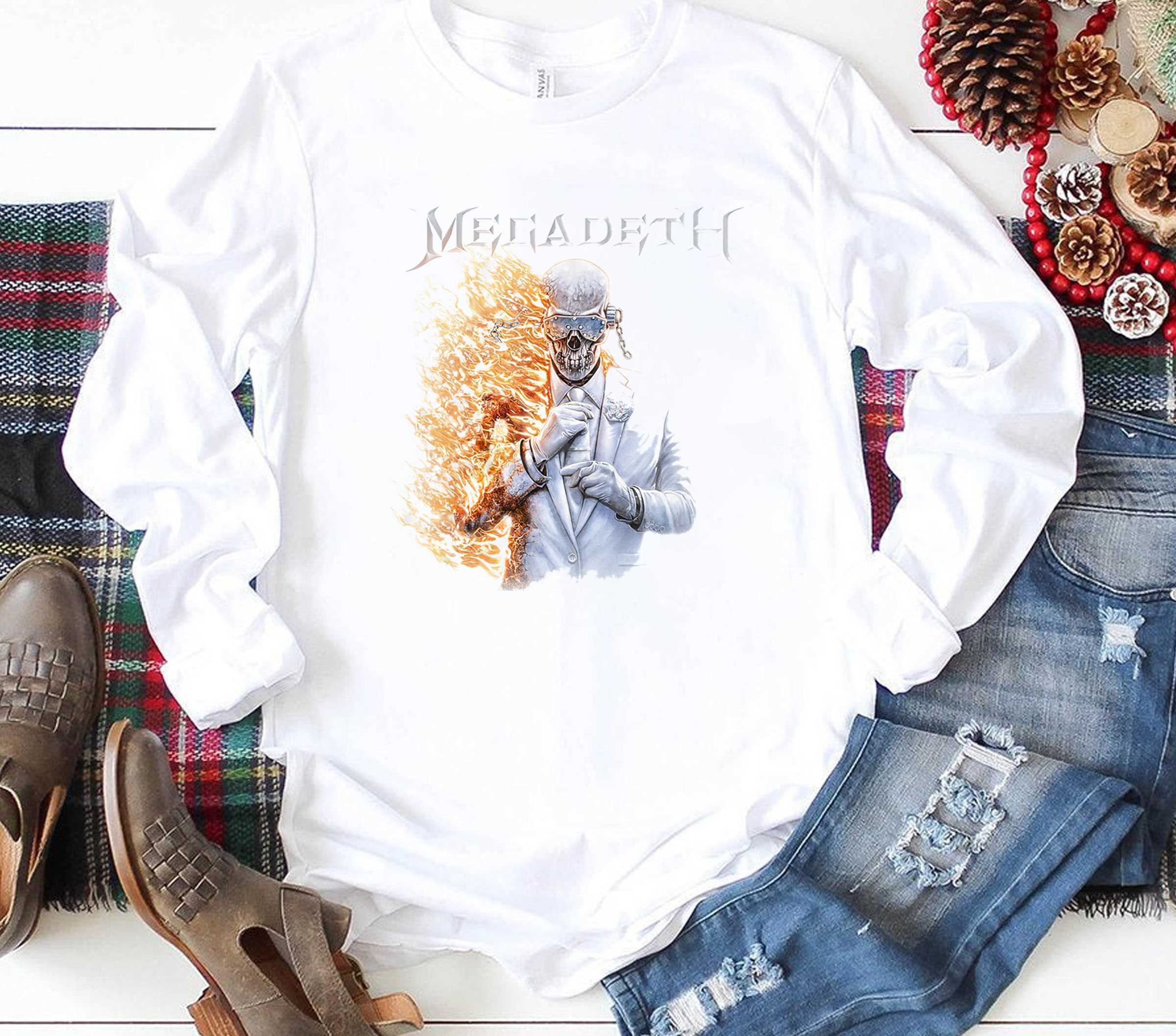 Unleash the metal fury and represent the technical dominance of the thrash icons with the Vic Rattlehead Flames Megadeth Tee. This design is a high-octane tribute to the band’s legendary mascot, featuring a stunning and aggressive graphic of Vic surrounded by high-contrast orange and red flames. The artwork captures the grit, the speed, and the “Peace Sells” energy that defined a generation of metal guitar work, utilizing a sharp, illustrative style that demands attention.Set on a premium white cotton tee, the vibrant colors of the graphic stand out with professional intensity that any headbanger will love. The shirt is crafted from ultra-soft ringspun cotton, providing a luxurious feel and a breathable fit that is perfect for long festival sets or heavy training sessions. It pays tribute to the hard work, the technical skill, and the uncompromising leadership of Dave Mustaine. The high-resolution print ensures every detail of Vic’s visor and the swirling fire is clear and sharp. It represents the heart and soul of metal excellence and the drive for perfection in every riff.Show the world that you’re a fan of the real work and stay ahead of the curve in band fashion. Whether you are in the front row or repping your musical roots in the street, this shirt ensures you look the part. Secure your place in the metal elite. Purchase the Vic Rattlehead Flames Megadeth Tee now and lead the charge!. T-shirt !