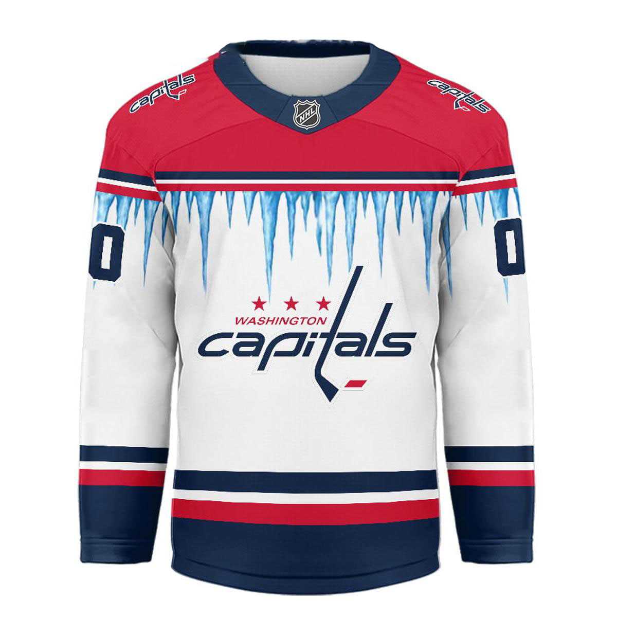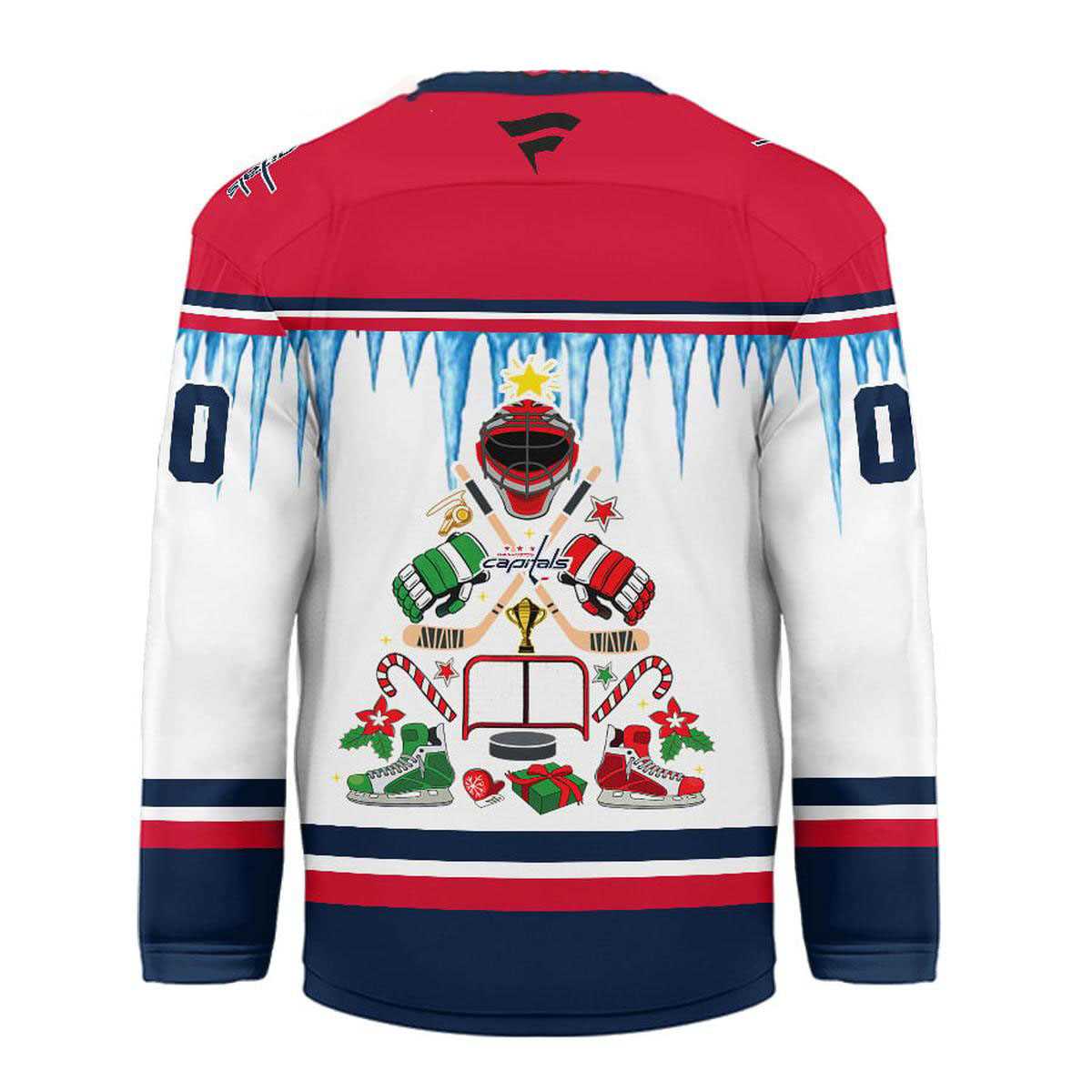 - Introducing the Washington Capitals Icicle Christmas Tree Custom Hockey Jersey , the perfect addition to any fan’s collection! celebrate the holidays in the nation’s capital with a jersey that is as patriotic as it is festive. The Washington Capitals design utilizes the team’s red, white, and blue to stunning effect. The bold red body of the jersey is capped with a white, snowy yoke that sends icicles cascading down the chest, framing the “Capitals” wordmark or eagle logo. It mimics the look of DC monuments covered in a fresh winter snow, blending civic pride with team loyalty.