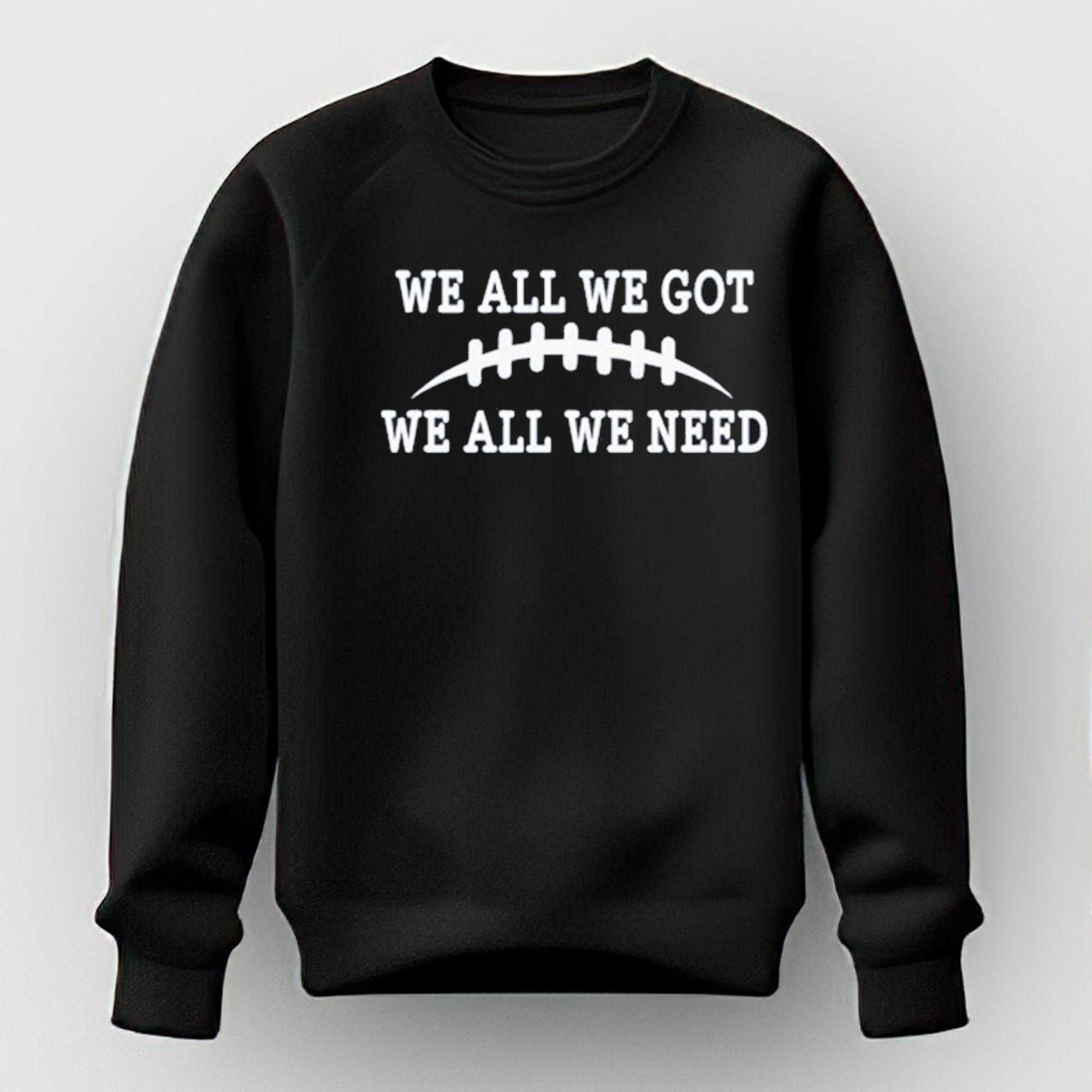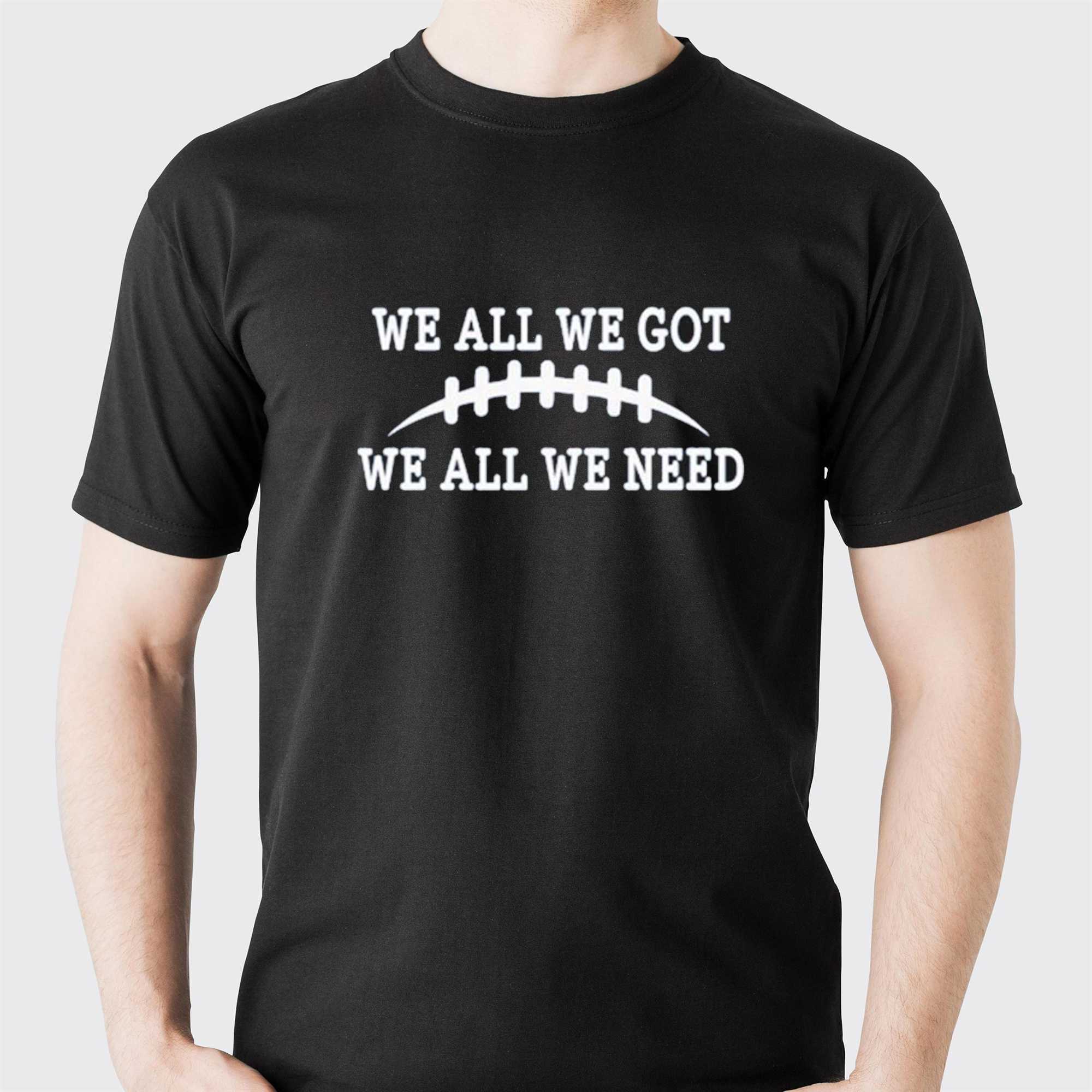 Embrace the core philosophy of teamwork and resilience with the We All We Got We All We Need Retro Shirt. This design is a powerful and minimalist tribute to athletic brotherhood, featuring the iconic football silhouette flanked by the inspiring and unifying mantra: “WE ALL WE GOT, WE ALL WE NEED.” It captures the spirit of the locker room—the shared sacrifice and uncompromising focus that defines a championship squad. The arched typography is rendered in a clean, collegiate font that radiates a classic, timeless energy. Set against a deep black background, the white and silver graphics pop with an intensity that matches the atmosphere of a high-stakes game night. The tee is crafted from heavyweight, premium cotton, offering a structured fit and long-lasting durability for those who stand with their team through every season. It’s an ideal choice for game-day tailgates, gym sessions, or daily wear where you want to signal your commitment to community and loyalty. Whether you’re a player, a coach, or a dedicated fan, this shirt represents the heart and soul of the game. Show the world that your family is united and stronger than ever. Stand with the team that knows exactly what they have and exactly what they need to succeed. Secure your piece of the tradition and buy the We All We Got We All We Need Retro Shirt now!.