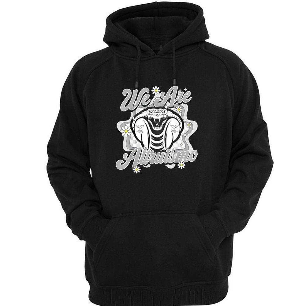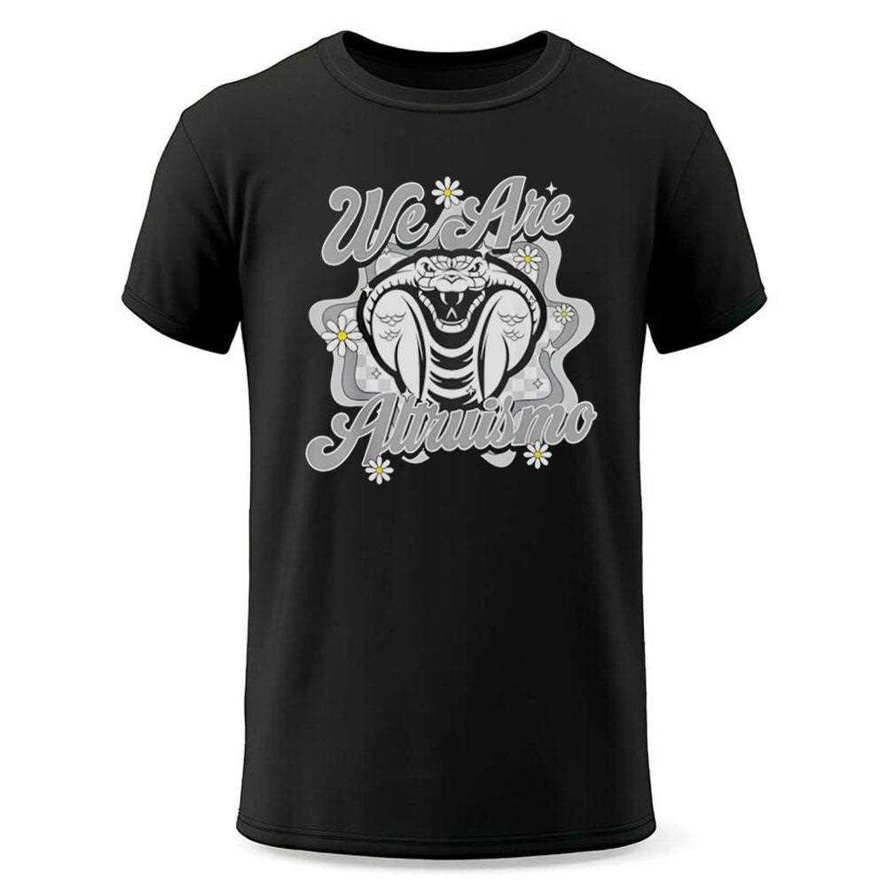 A powerful and stylish design with a positive message. This t-shirt for the brand “Altruismo” features a cool, crest-style logo of a cobra, with the simple, unifying statement, “WE ARE ALTRUISMO.” For the person who believes in doing good and looking good while doing it. Show your support for the brand and its message with this awesome tee..