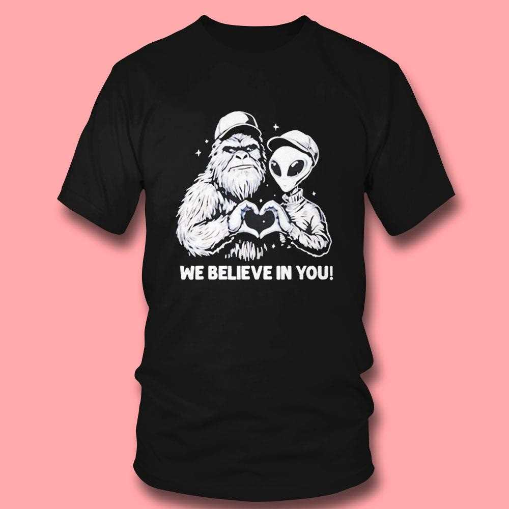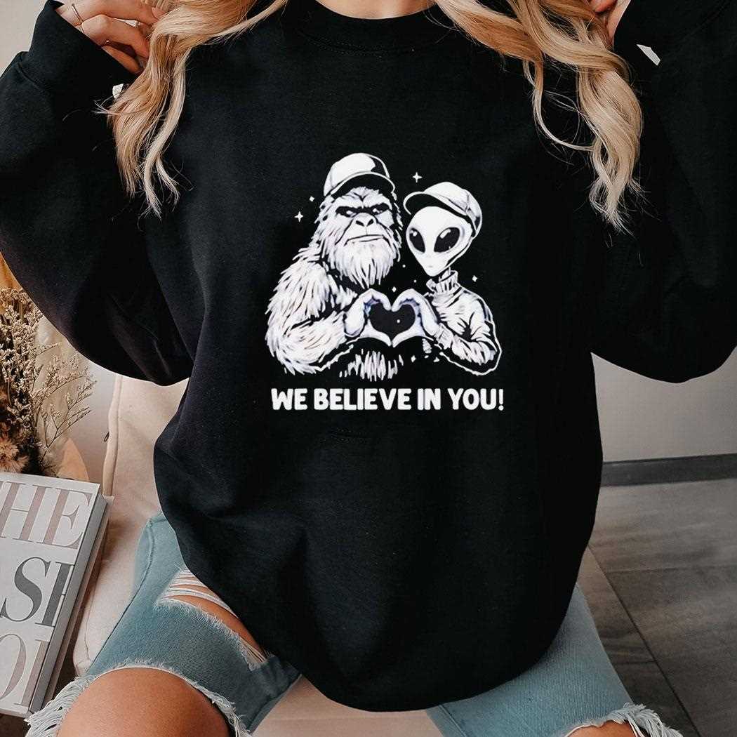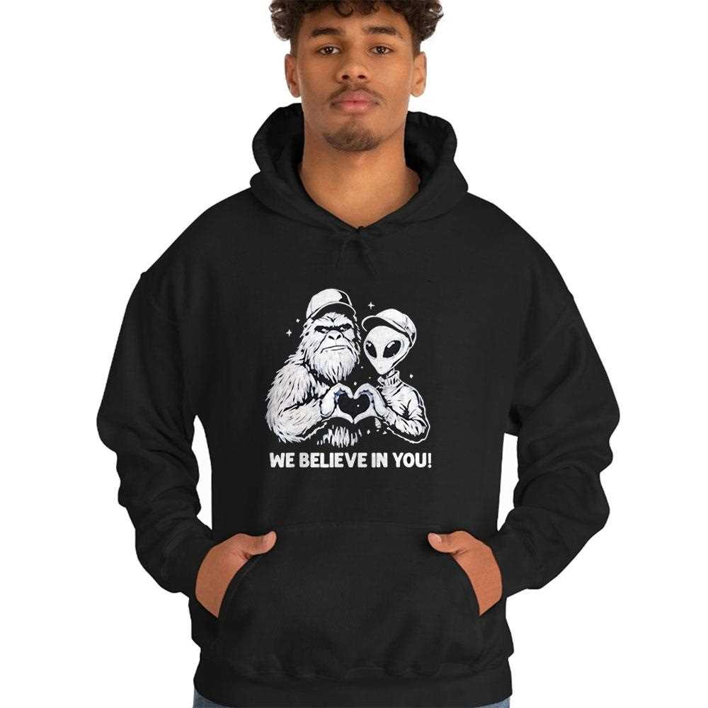 For the true believer. This sweet and heartwarming t-shirt features a friendly Bigfoot and a classic grey alien making a heart shape with their hands, and the simple, supportive message, “WE BELIEVE IN YOU.” It’s a perfect blend of cryptozoology, UFOlogy, and pure positivity. The truth is out there… and so is this awesome shirt! The perfect tee for any fan of the unexplained who also loves to spread good vibes. Get yours and keep believing!.