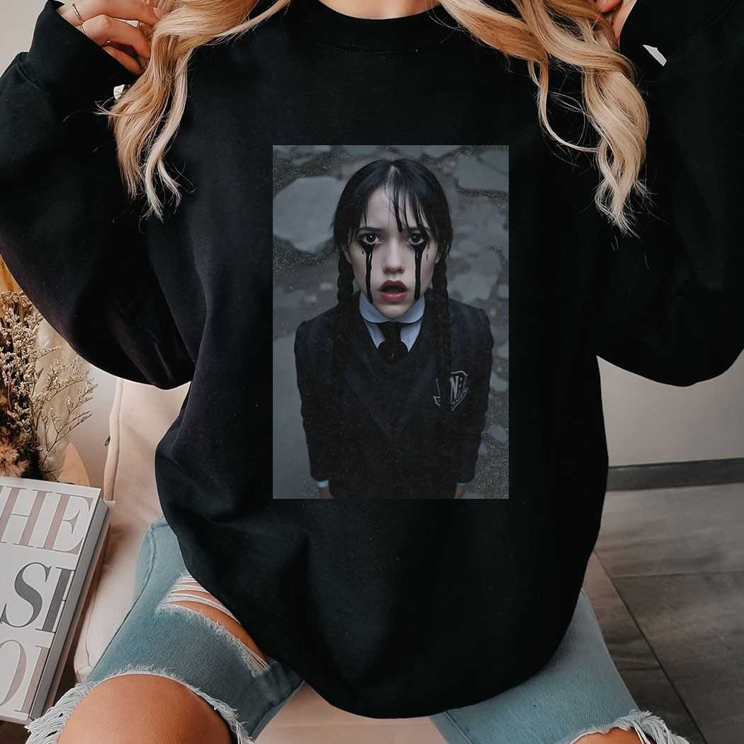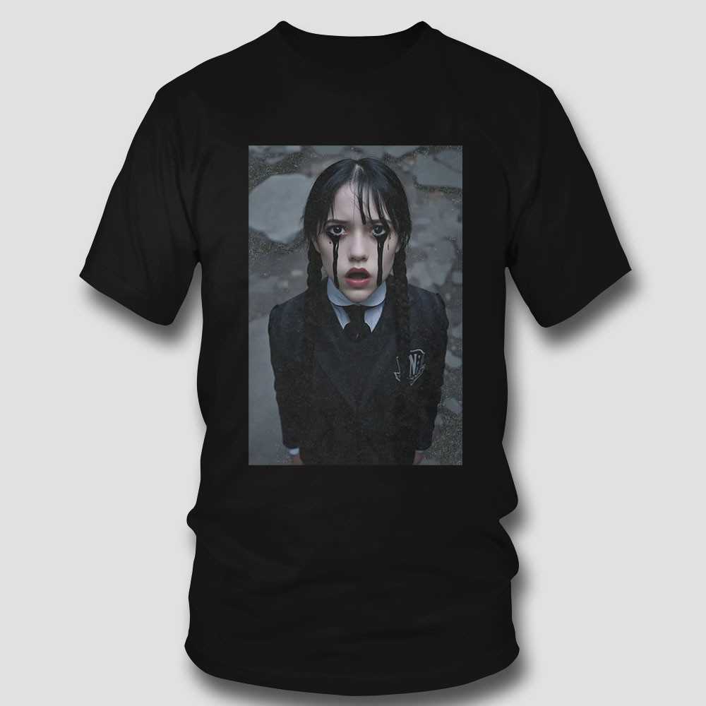 Dive into the delightfully morbid world of Wednesday Addams with our “Crying Black Tears” Tee. This unique design captures Wednesday’s signature melancholic charm, offering a darkly whimsical addition to your wardrobe. Made from ultra-soft, breathable cotton, this tee ensures comfort while you channel your inner goth icon. The captivating graphic features Wednesday, a single black tear rolling down her cheek – a poignant and stylish representation of her iconic persona. The stark contrast and artistic rendering make this tee a standout piece, perfect for fans who appreciate the macabre beauty of the Addams Family. It’s a statement of individuality and a celebration of all things wonderfully strange.. T-shirt !