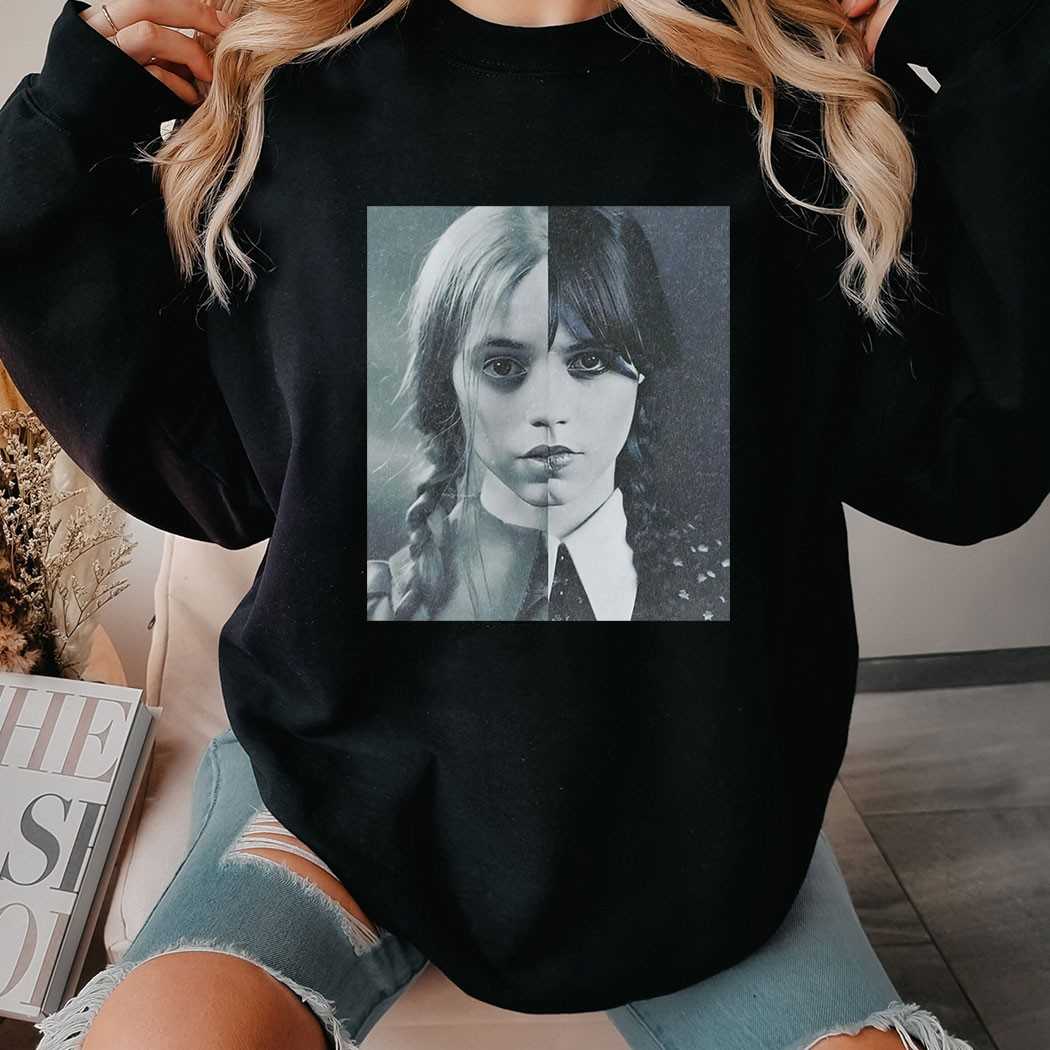 Explore the enigmatic layers of Wednesday Addams’ character with our “Dual Persona” Tee. This design delves into the intriguing complexity of everyone’s favorite dark ingenue, offering a fresh perspective on her iconic look. Crafted from high-quality, comfortable fabric, this tee is perfect for everyday wear, allowing you to subtly showcase your affinity for the macabre. The intriguing graphic subtly blends two facets of Wednesday’s personality or style, creating a visually compelling and thought-provoking image. The artistic composition and subtle details invite a second look, reflecting the depth of her character. This tee is a conversation starter, a tribute to the multifaceted nature of an enduring pop culture figure.. T-shirt !