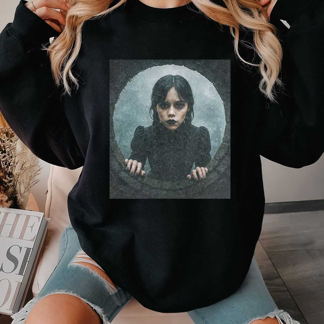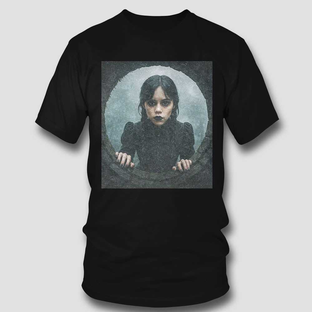 Peer into the eerie and enchanting world of Wednesday Addams with our “Peeking Through the Portal” Tee. This captivating design offers a glimpse of Wednesday in a mysterious setting, inviting intrigue and curiosity. Made from soft, durable cotton, this tee provides maximum comfort for any occasion. The imaginative graphic features Wednesday’s iconic silhouette or face partially obscured, as if she’s emerging from a shadowy portal or window, adding an element of suspense and dark fantasy. The atmospheric details and unique composition make this tee a fascinating piece for any fan of the Addams Family. It’s an artistic interpretation that captures her essence in a truly unique way.. T-shirt !