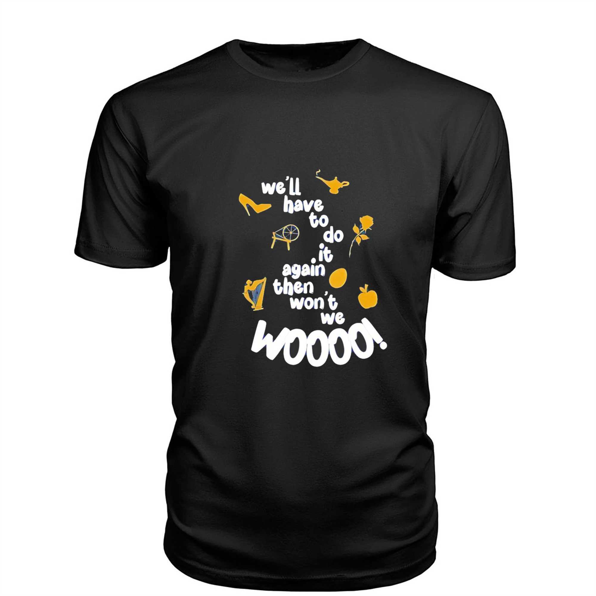 Inject a dose of high-energy humor and pop-culture flair into your wardrobe with the incredibly unique Well Have To Do It Again Then Wont We Woooo Tee. This design is a masterclass in kitschy, retro-inspired aesthetic, capturing a sense of playful irony that resonates with fans of cult classics and campy theater. The central graphic features a pair of vibrant yellow high-heeled shoes, surrounded by whimsical patterns and a bold, energetic quote that echoes the excitement of a legendary performance. It is a brilliant piece of visual comedy for those who enjoy making a statement that is as fun as it is mysterious.