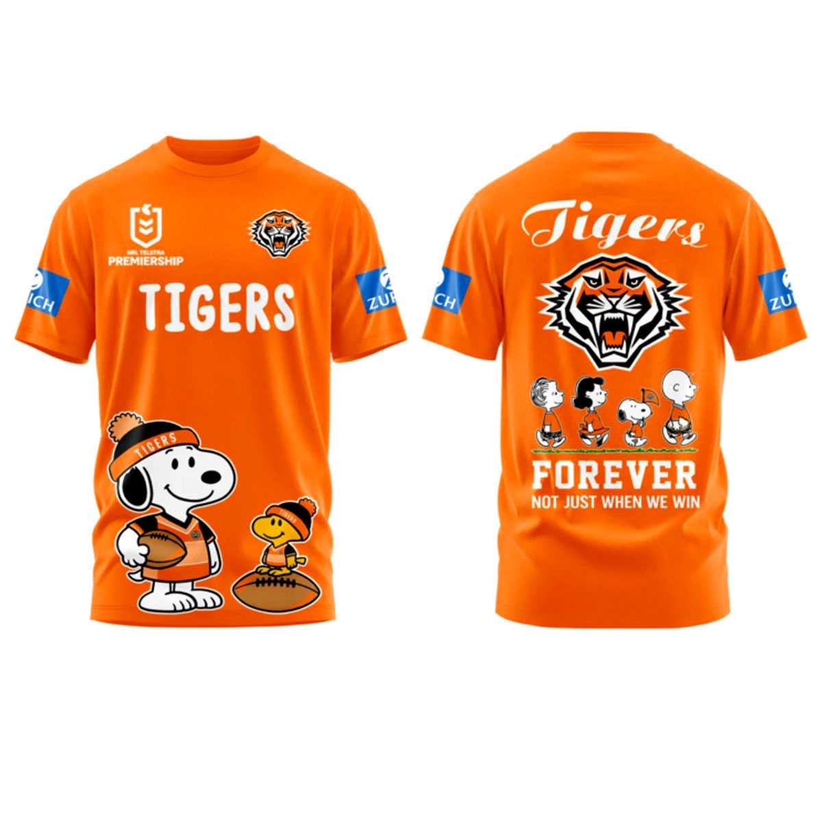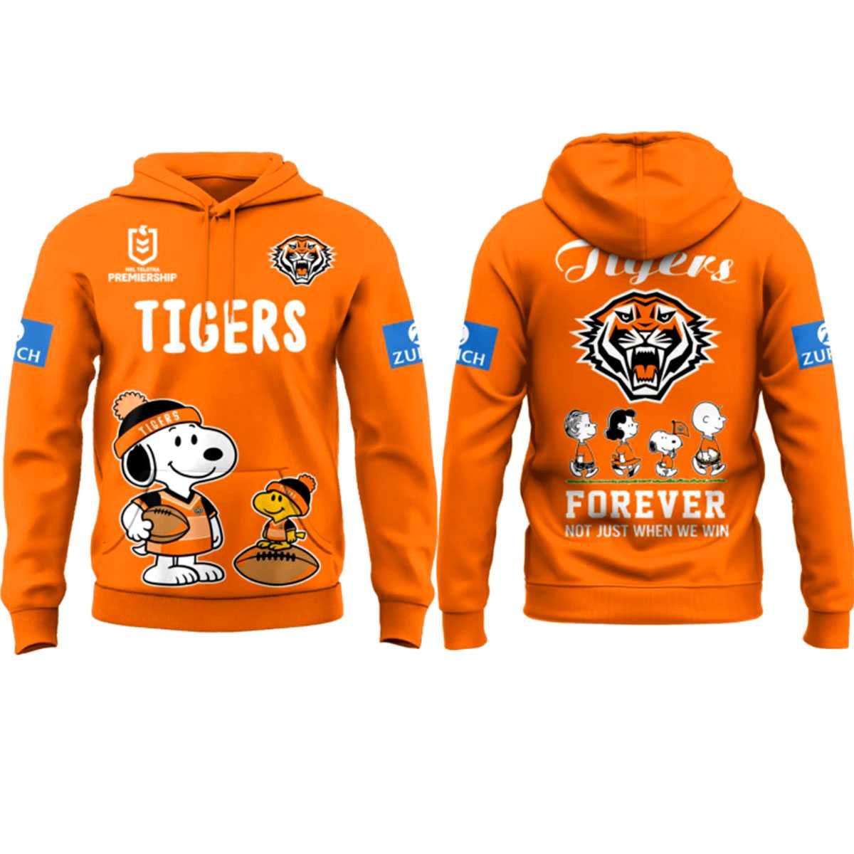 The front of the hoodie features a meticulously detailed NRL Premiership logo alongside the striking Wests Tigers crest. Dominating the lower half is an adorable graphic of Snoopy and Woodstock, both decked out in miniature Tigers gear and ready for game day with a rugby ball in hand. The word “TIGERS” is printed in clean, bold white lettering, creating a perfect aesthetic balance against the energetic orange backdrop.